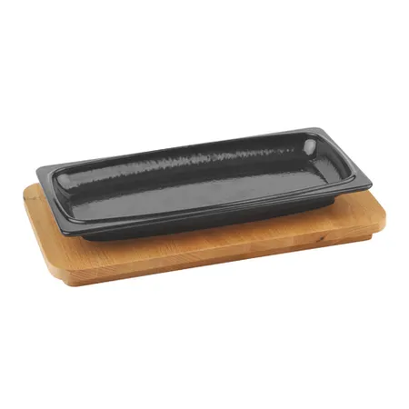 Сервировочное блюдо прямоугольное на деревянном подносе и съемная литая чугунная панель. черное. 13x25cm. (не включает соусники)