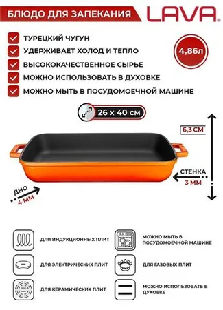 Блюдо прямоугольное 26x40 см, с 2-мя ручками, чугун, цвет оранжевый