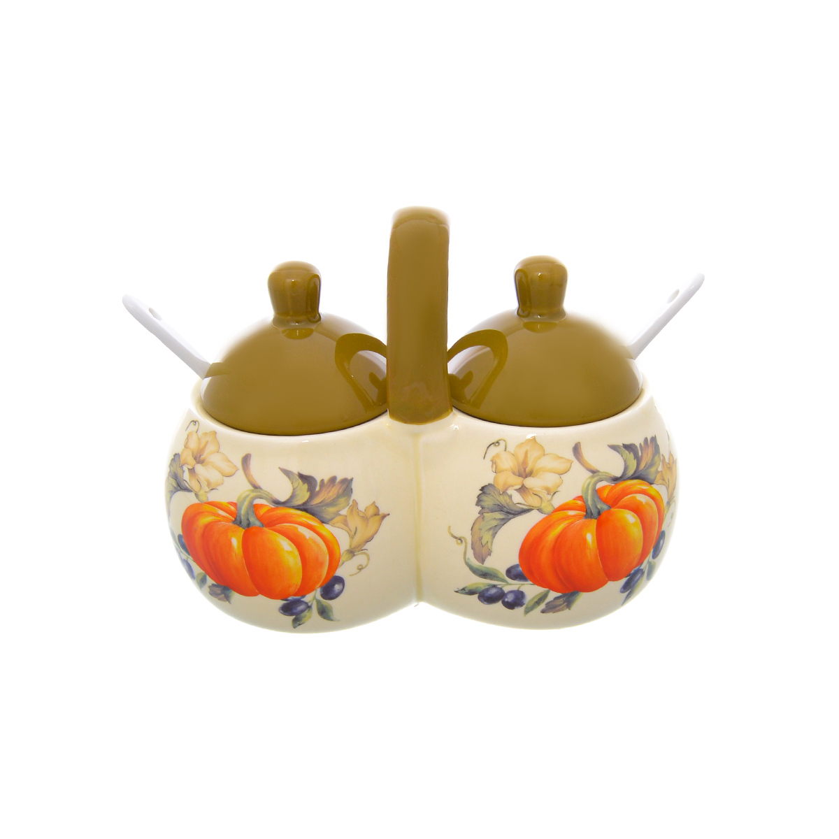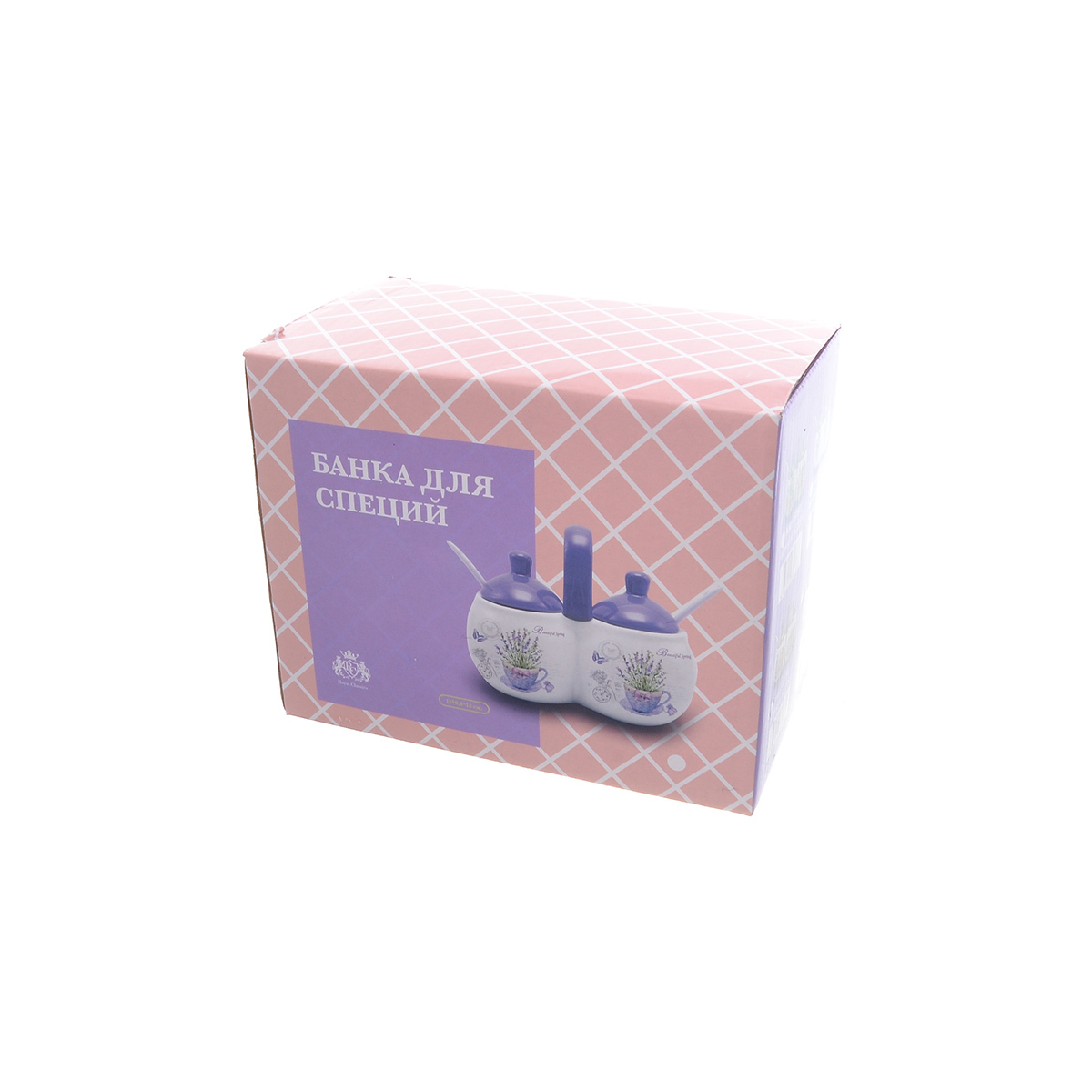 Новое поступление! Банка для специй двойная с ложками имеет оригинальный дизайн и весьма удобную форму. Практичный и оригинальный аксессуар для сервировки стола, выполненный в стиле Прованс и декорированный рисунком по специальной технике с защитой от внешних воздействий. Изделие из керамики легко моется и на протяжении долгих лет сохраняет привлекательный внешний вид.
