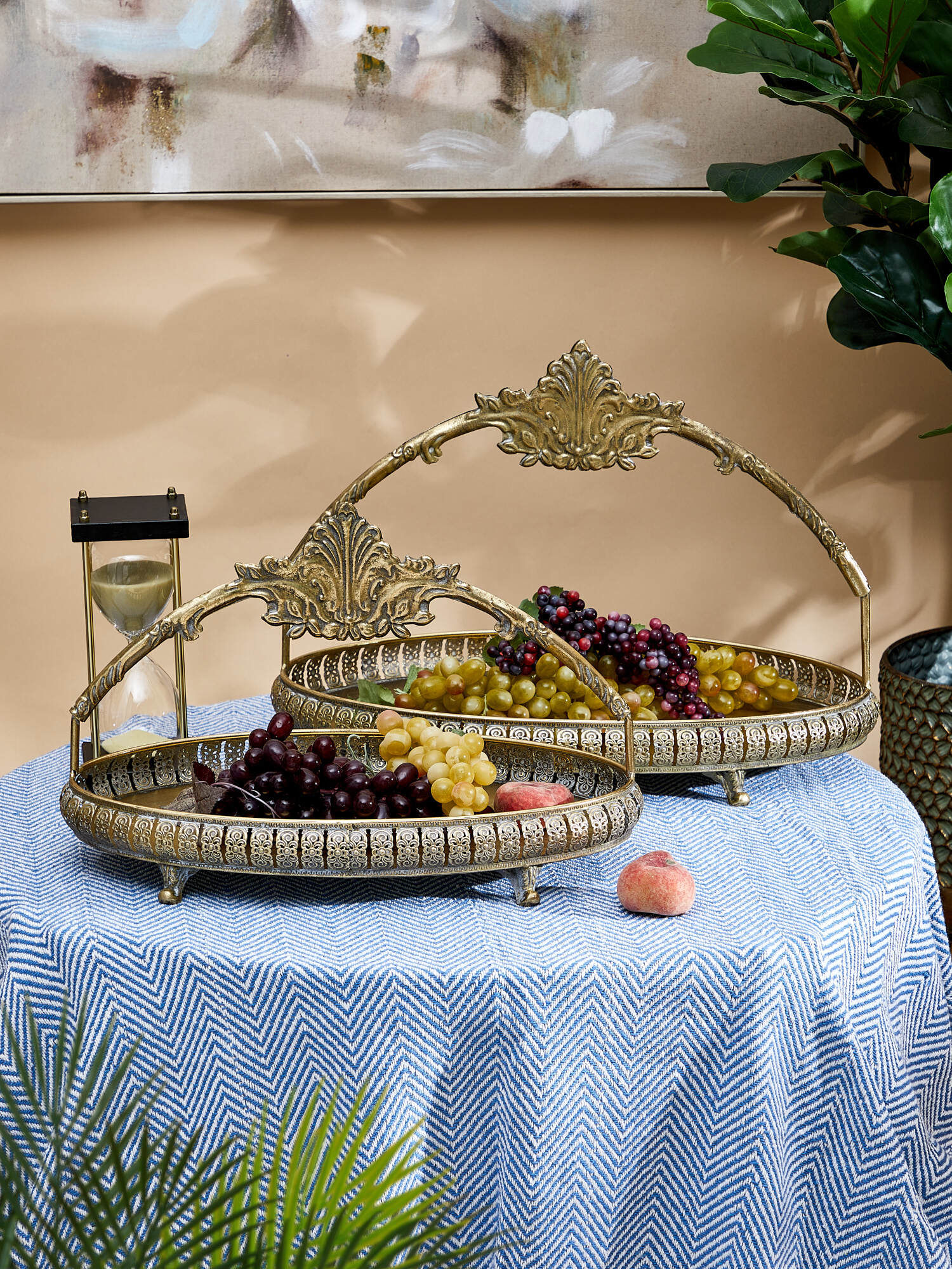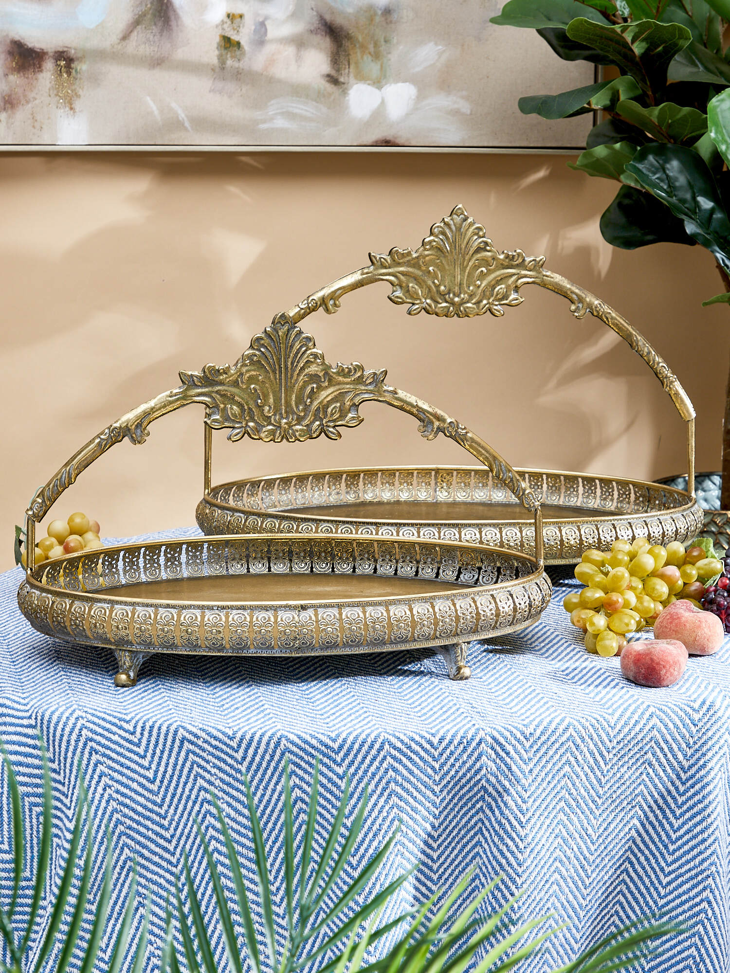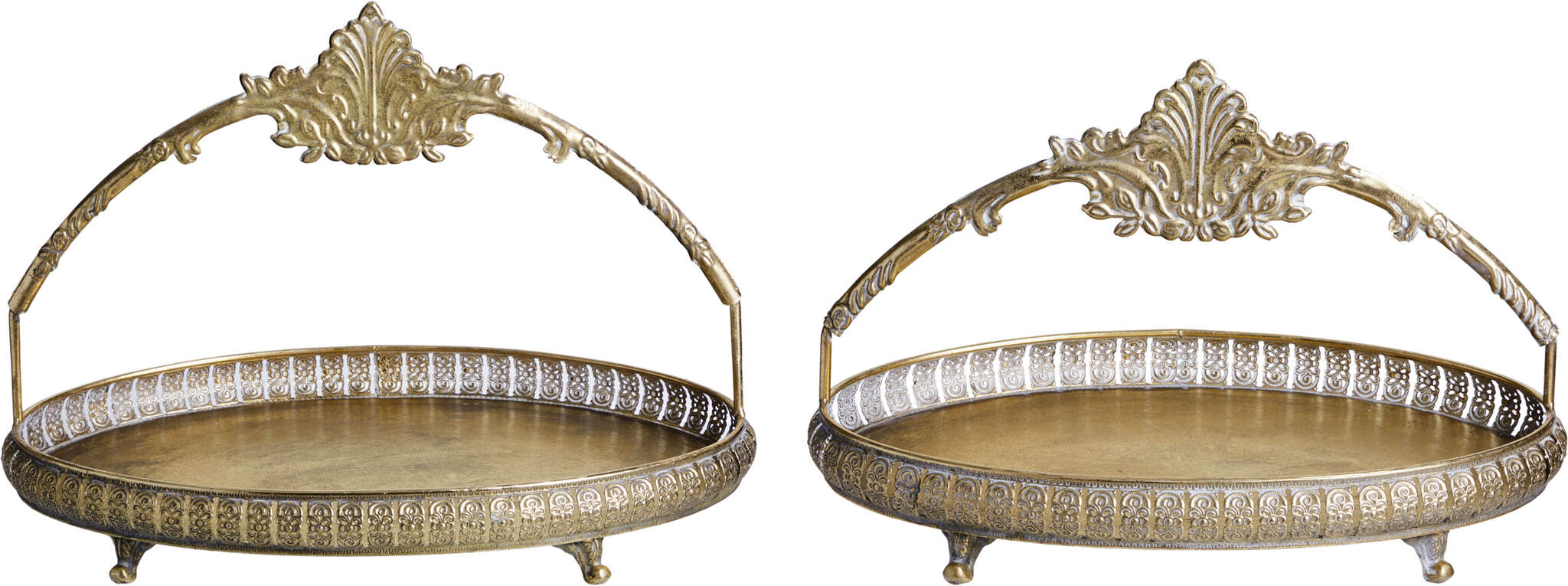 Набор из двух металлических блюд с ручками Эфиопия, выполненные в африканском стиле с напылением золотистого цвета, придаст современный вид любому столу. Изделия имеют признаки искусственного состаривания, их поверхность декорирована с эффектом патинирования, а наличие сварочных фрагментов подчеркивают принадлежность к ручной работе. Сдержанный дизайн станет отличным акцентом и дополнением к Вашему интерьеру. Эксклюзивные формы и фактуры навеяло богатство культуры Африки, множество художественных традиций и таинственная атмосфера, окутывающая неподражаемостью.