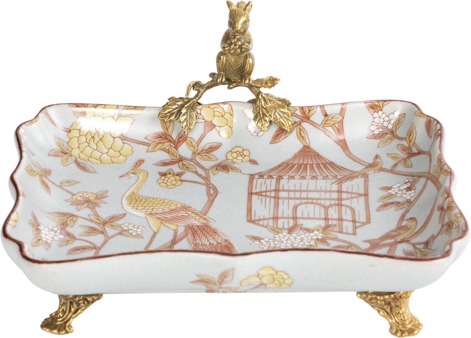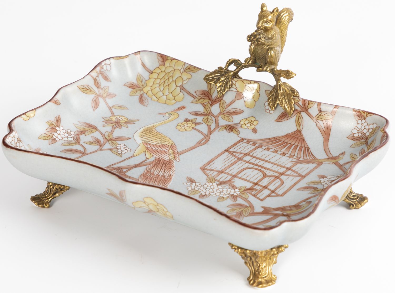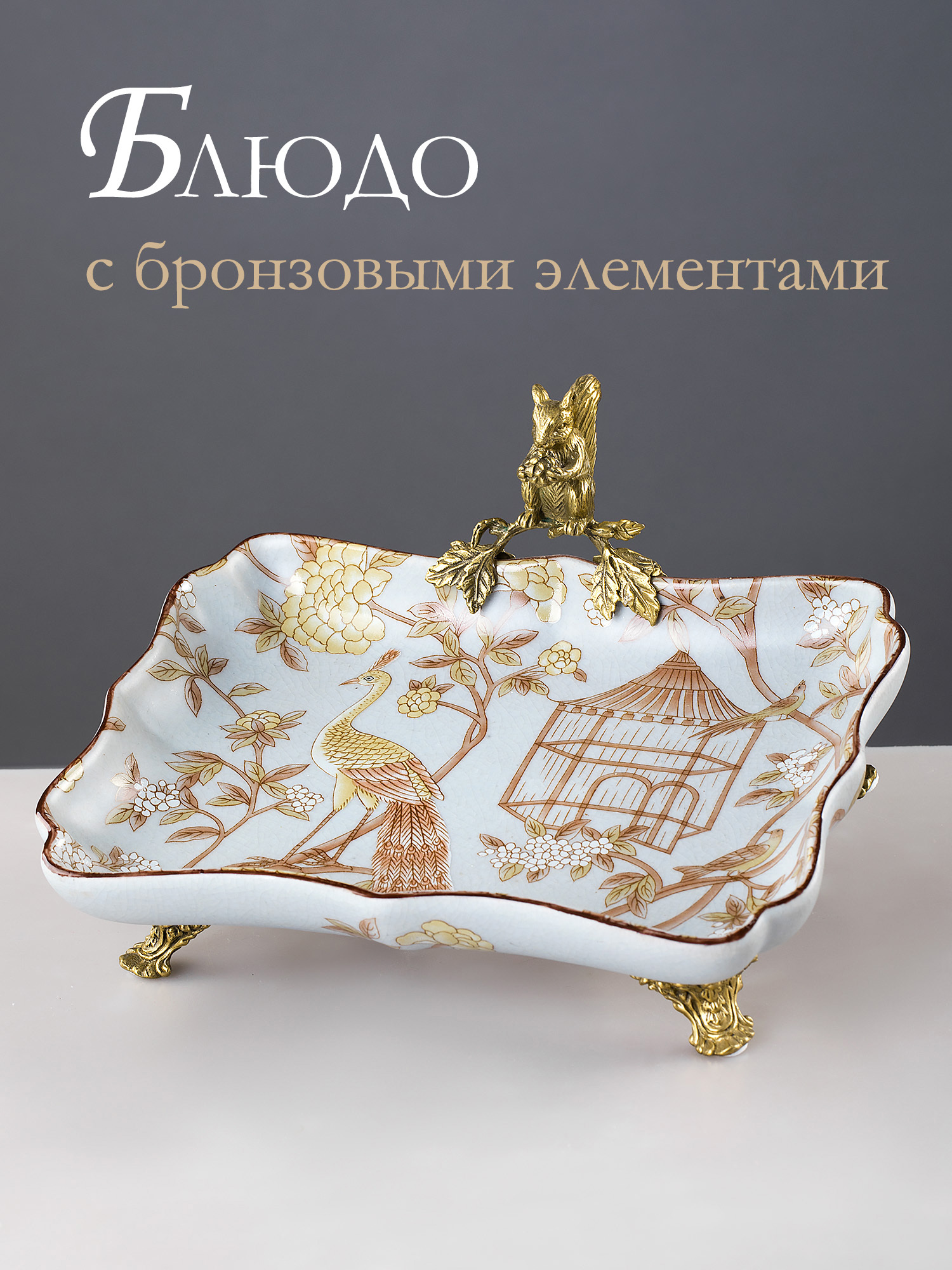 Блюдо с белочкой, выполненное из фарфора с бронзовыми элементами. Уникальное изделие ручной работы. При производстве этих художественных изделий из фарфора с бронзой используются вековые традиции китайских мастеров. Видимые трещинки (кракелюры) делаются по уникальной технологии, что придает более благородный вид старинного изделия.