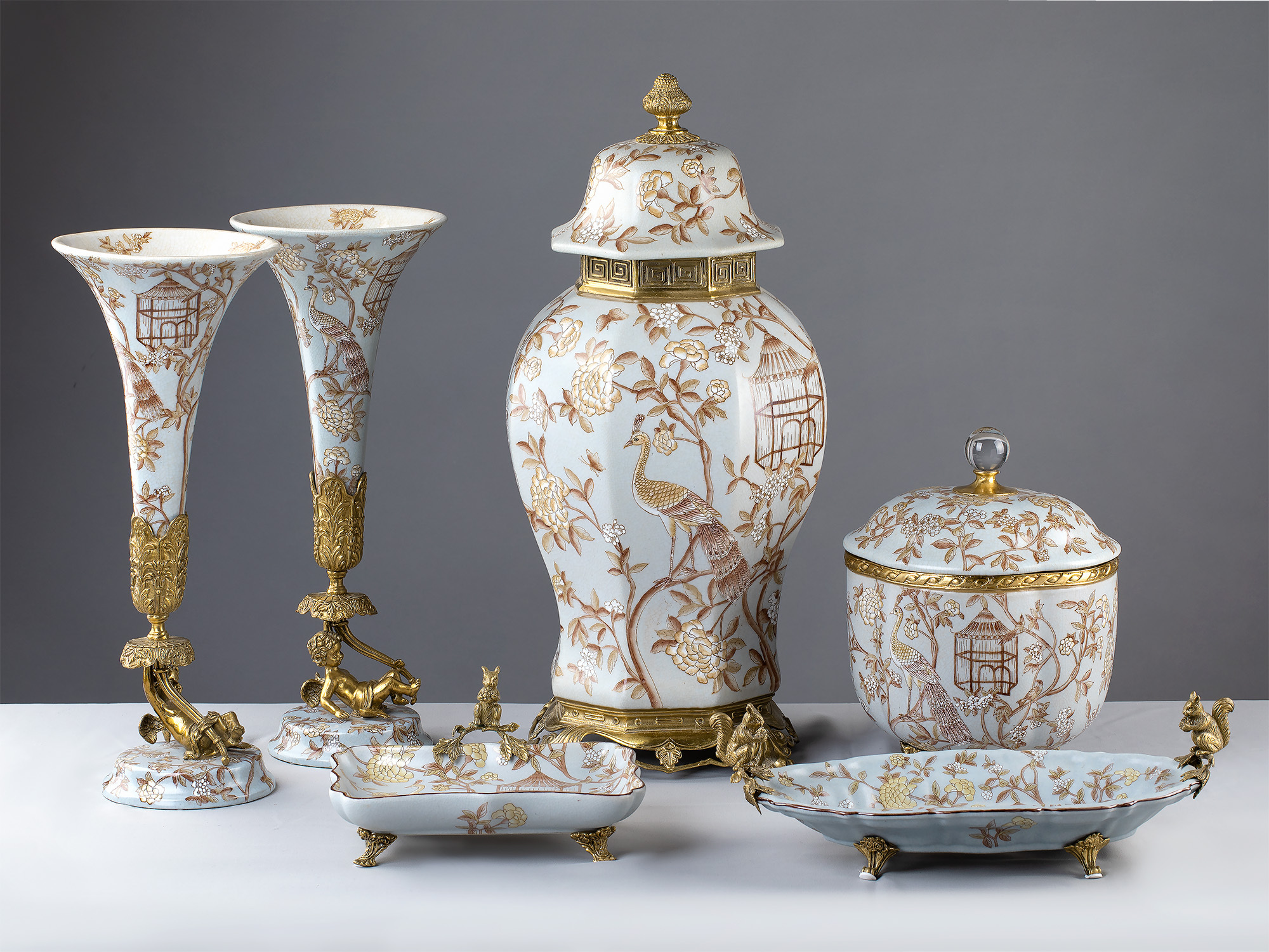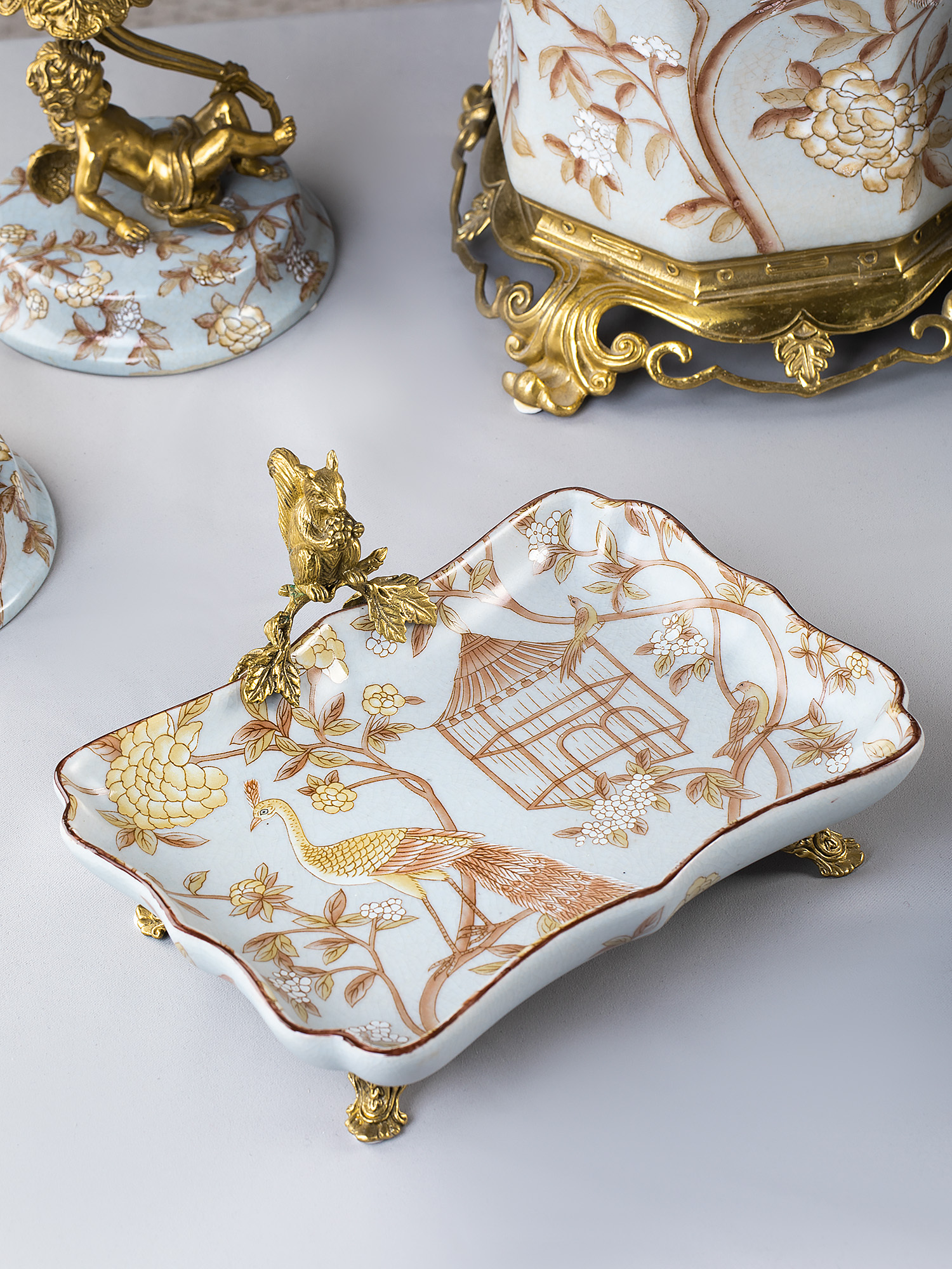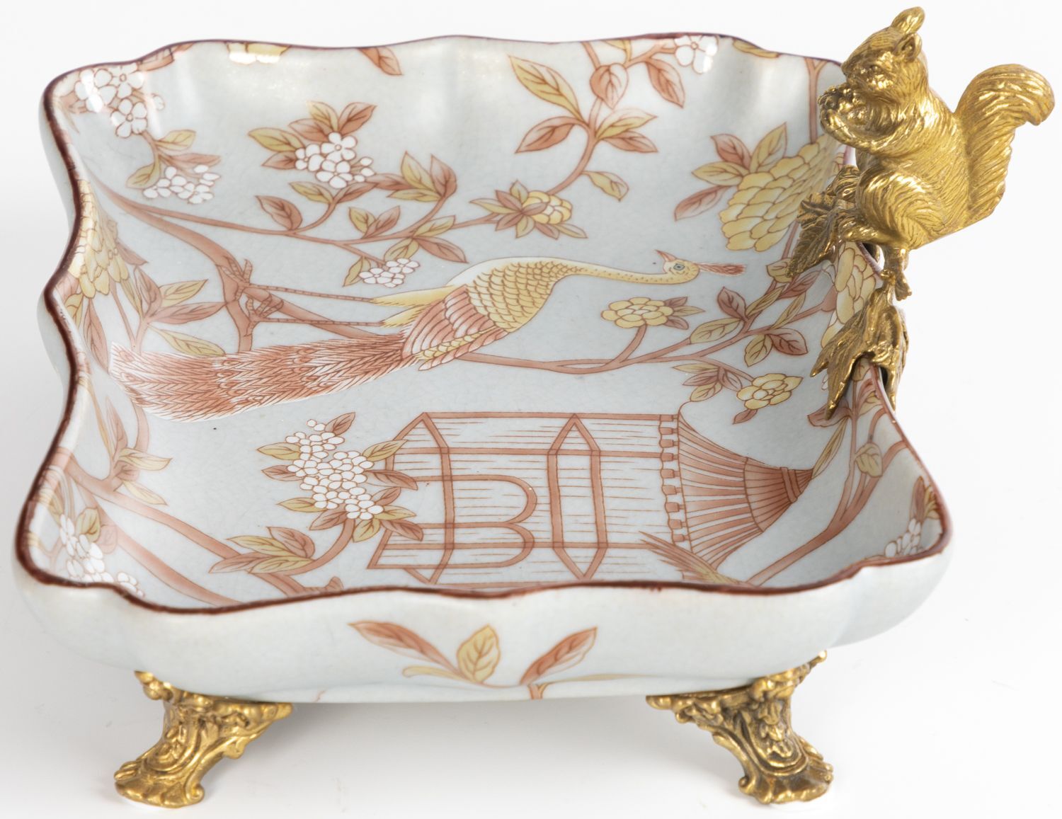Блюдо с белочкой, выполненное из фарфора с бронзовыми элементами. Уникальное изделие ручной работы. При производстве этих художественных изделий из фарфора с бронзой используются вековые традиции китайских мастеров. Видимые трещинки (кракелюры) делаются по уникальной технологии, что придает более благородный вид старинного изделия.