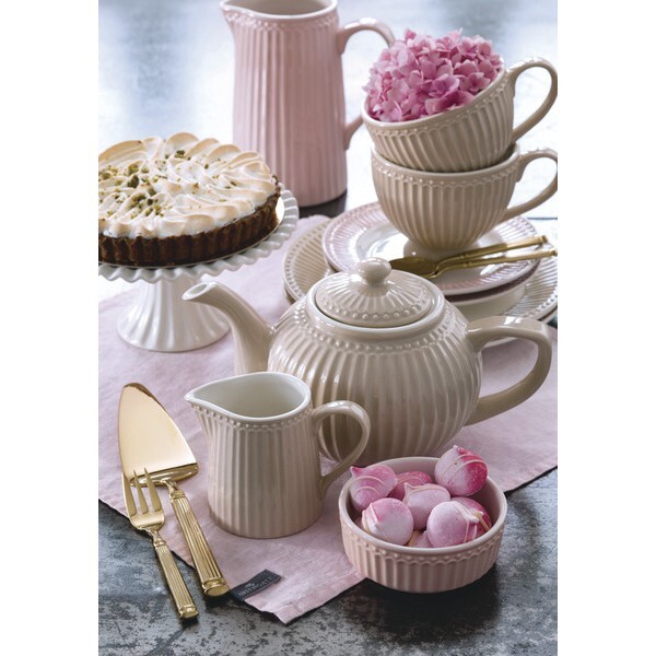 Классическое блюдо диаметром 27 см. легко гармонирует с традиционными предметами сервировки стола, также является самостоятельным акцентом в сервировке, благодаря выразительному дизайну. Центральная часть блюда выполнена в базовом белом цвете, а широкие бортики решены с помощью блестящей глазури. Четкие объёмные грани и ритмичные точки по всей окружности блюда оттеняют цвет глазури и придают предмету винтажное очарование. Высококачественный фарфор в основе изделия обладает экологически чистыми свойствами, не подвержен разрушению от перепада температур и позволяет мыть блюдо в посудомоечной машине и использовать в микроволновой печи. Данный продукт проходит стадию ручной обработки, поэтому на каждом изделии присутствуют индивидуальные особенности покрытия, которые не влияют на функциональность продукта и не являются дефектом. "GreenGate – скандинавская компания с почти тридцатилетней историей и поклонниками по всему миру. Изюминкой компании является знаменитая формула «mix and match» (смешивай и сочетай), заключающаяся в возможности комбинирования изделий в зависимости от собственных предпочтений. Базовый ассортимент коллекции Alice идеально сочетается с посудой из ранних и будущих коллекций GreenGate, позволяя ей быть как основой, так и связующим звеном с другими коллекциями бренда.