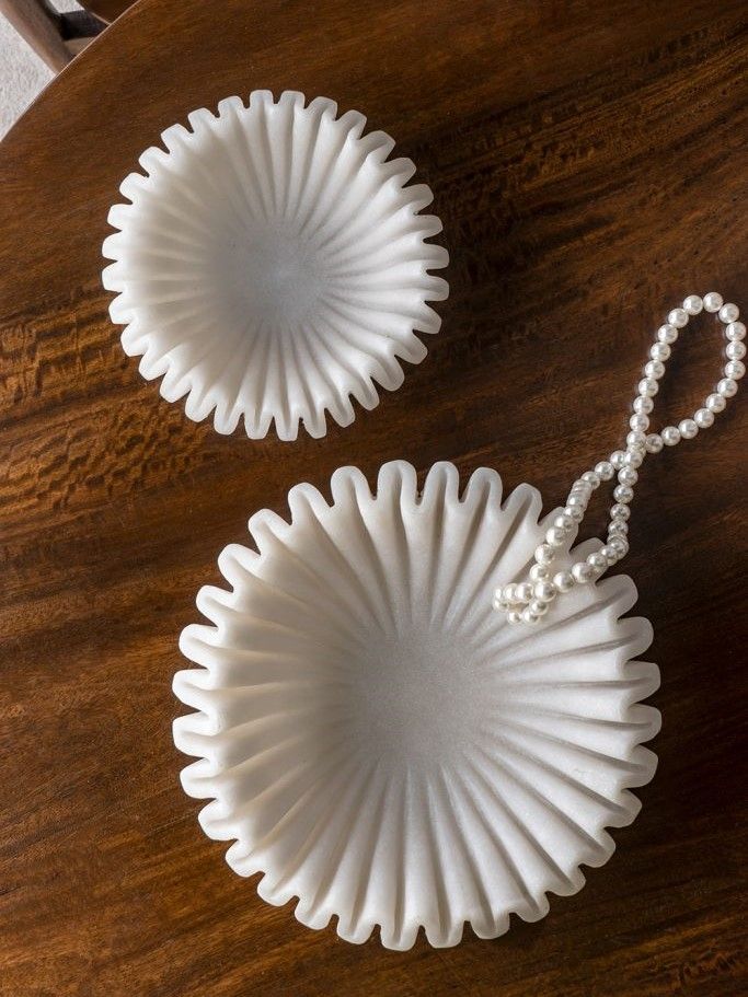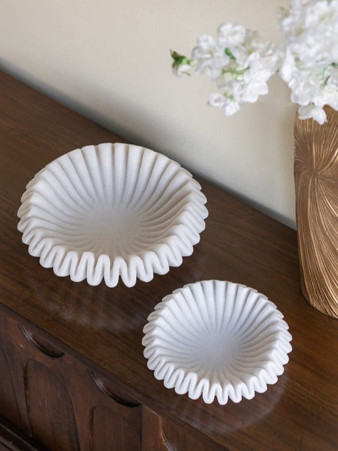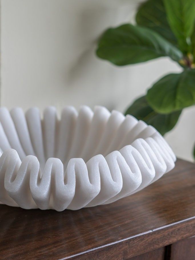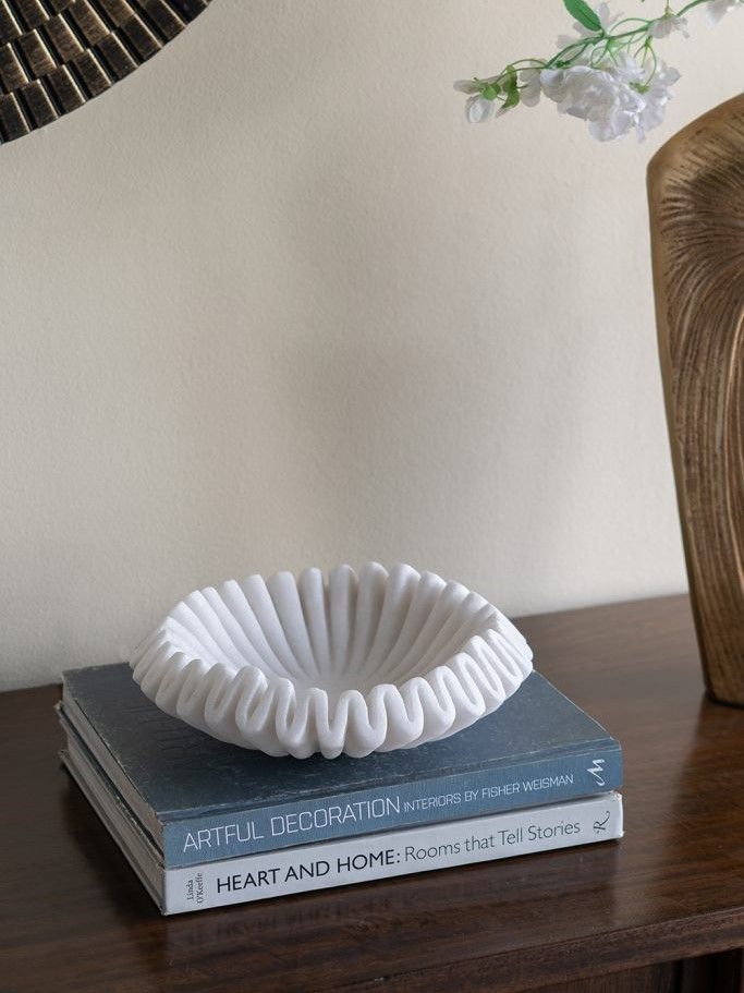 Интересное декоративное блюдо с волнистыми краями, окрашенными в естественный белый цвет, можно использовать в качестве предмета декора в сочетании с яркими акцентами, украшая любую поверхность в вашем доме. Нейтральная цветовая гамма и плавные линии позволяют этому изделию гармонично сочетаться с минималистичным, современным, прибрежным стилем и стилем ваби-саби, органично вписываясь в любой интерьер.