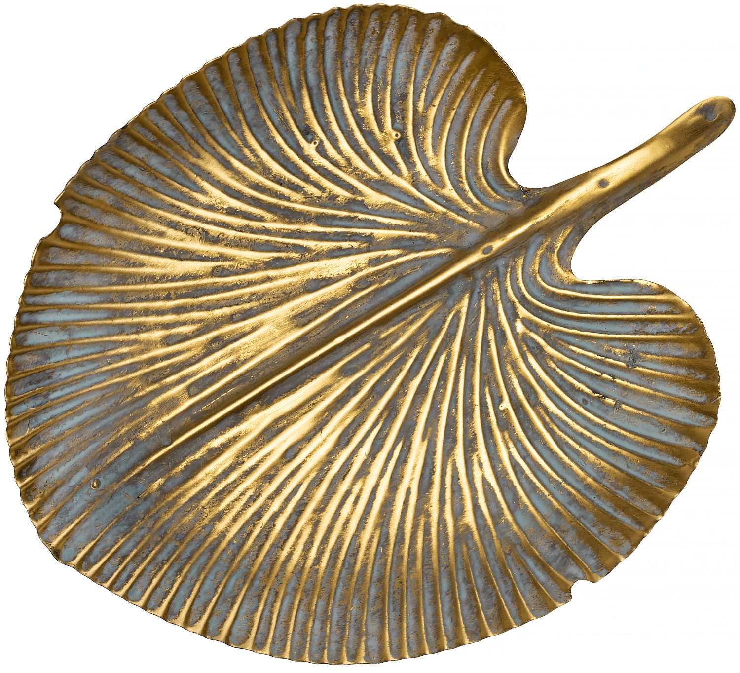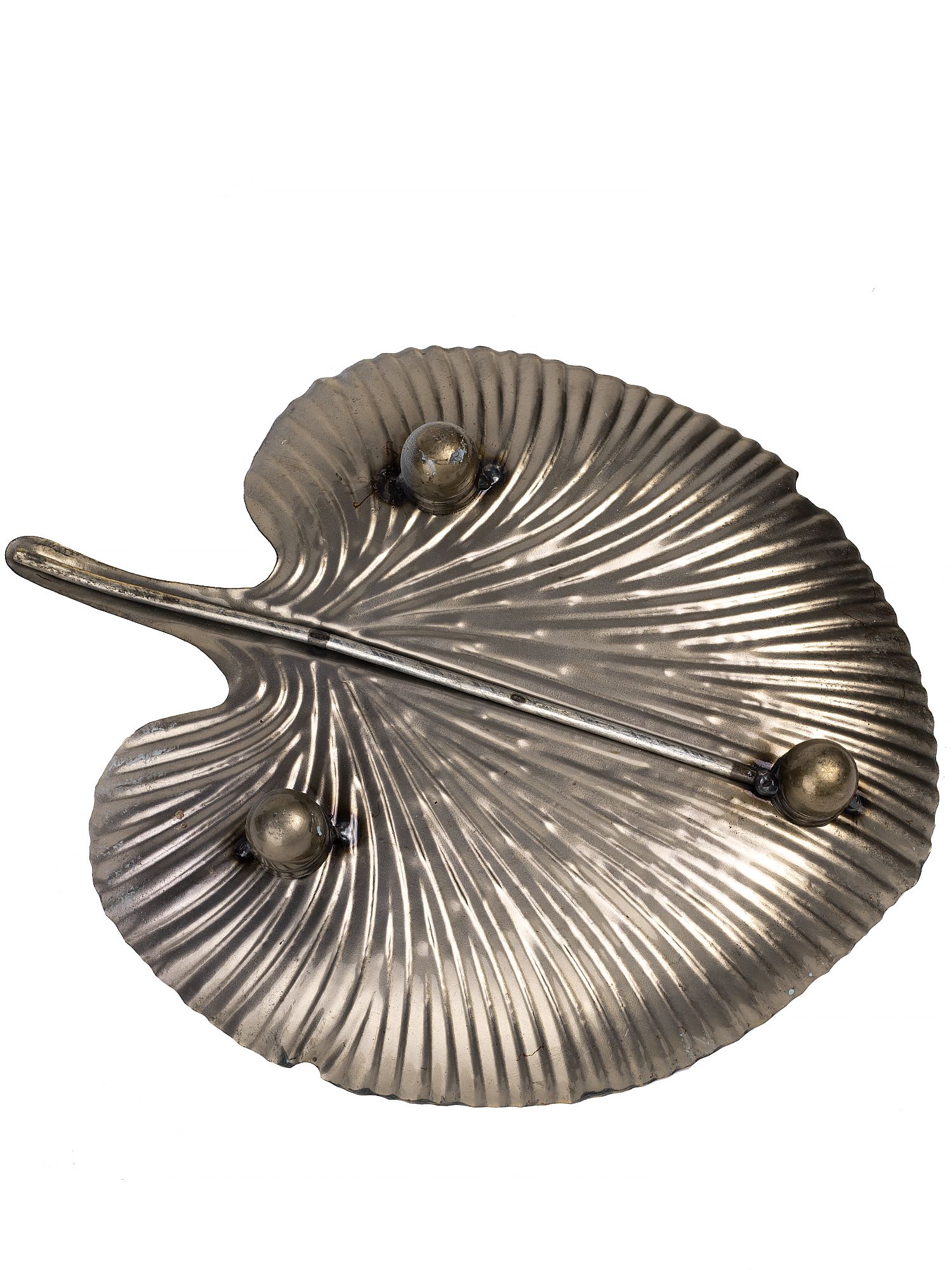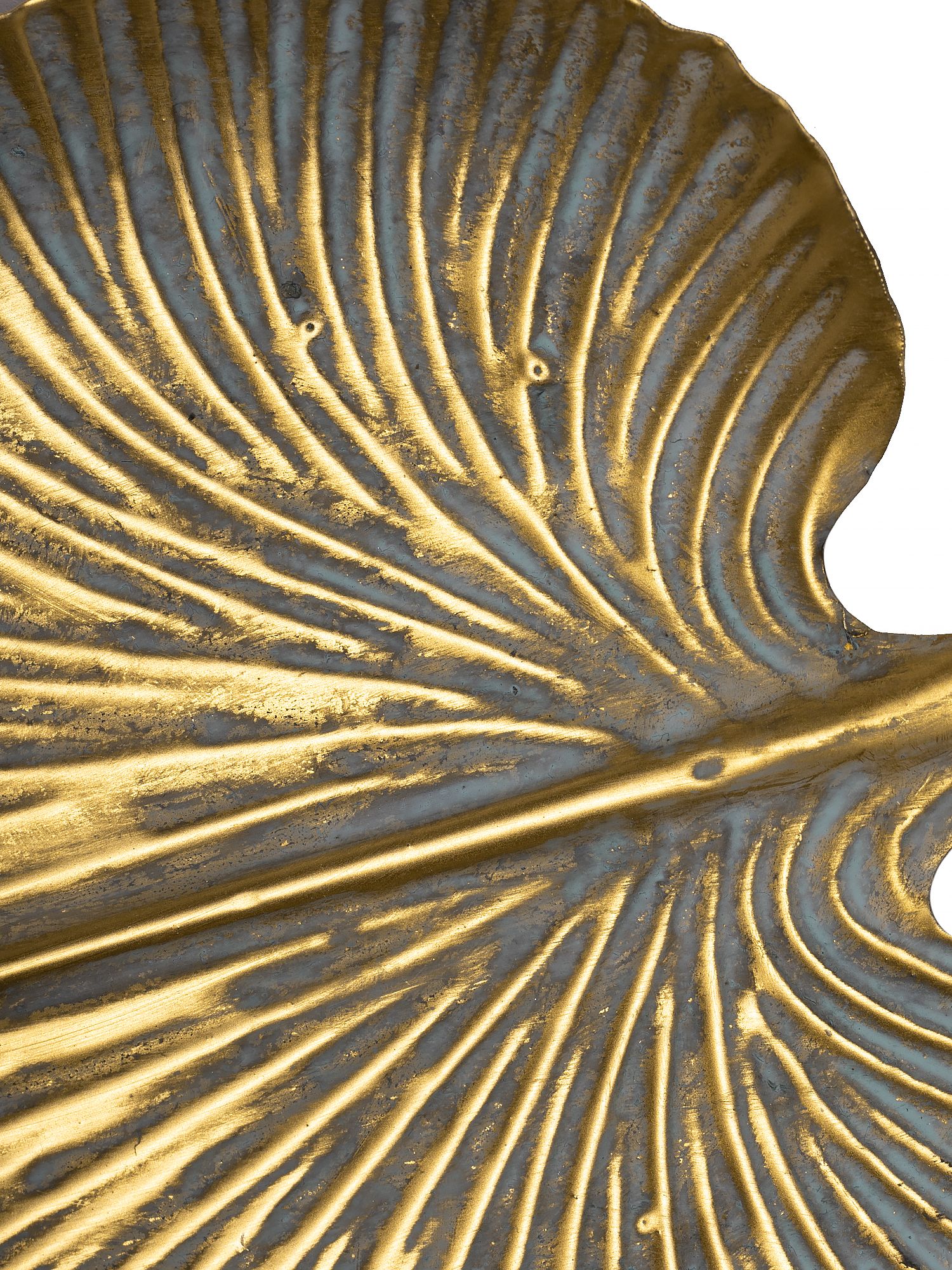 Декоративное блюдо в виде листа украшено блестящей золотистой отделкой, что будет определенно привлекать внимание. Изделие имеет признаки искусственного состаривания, поверхность декорирована с эффектом патинирования, а наличие сварочных фрагментов подчеркивают принадлежность к ручной работе. Изделие станет центральным элементом для журнальных столиков, обеденных столов и других подобных мест. Оно идеально впишется как в помещение с винтажным дизайном, так и в современные стили.