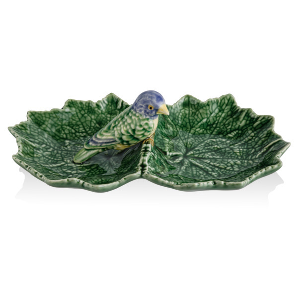 Блюдо двухсекционное Bordallo Pinheiro Листья 22 см, с синей птичкой, керамика