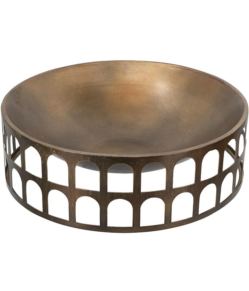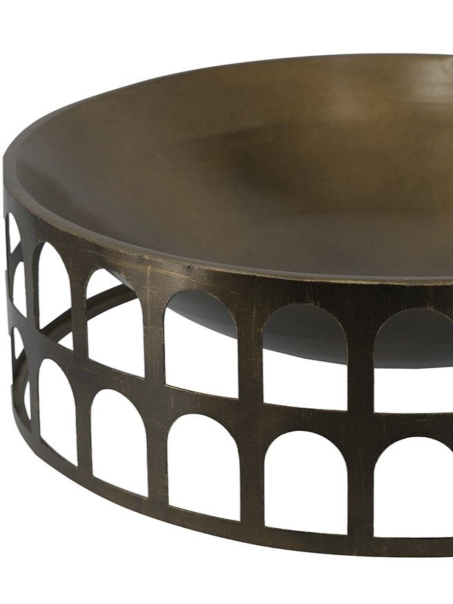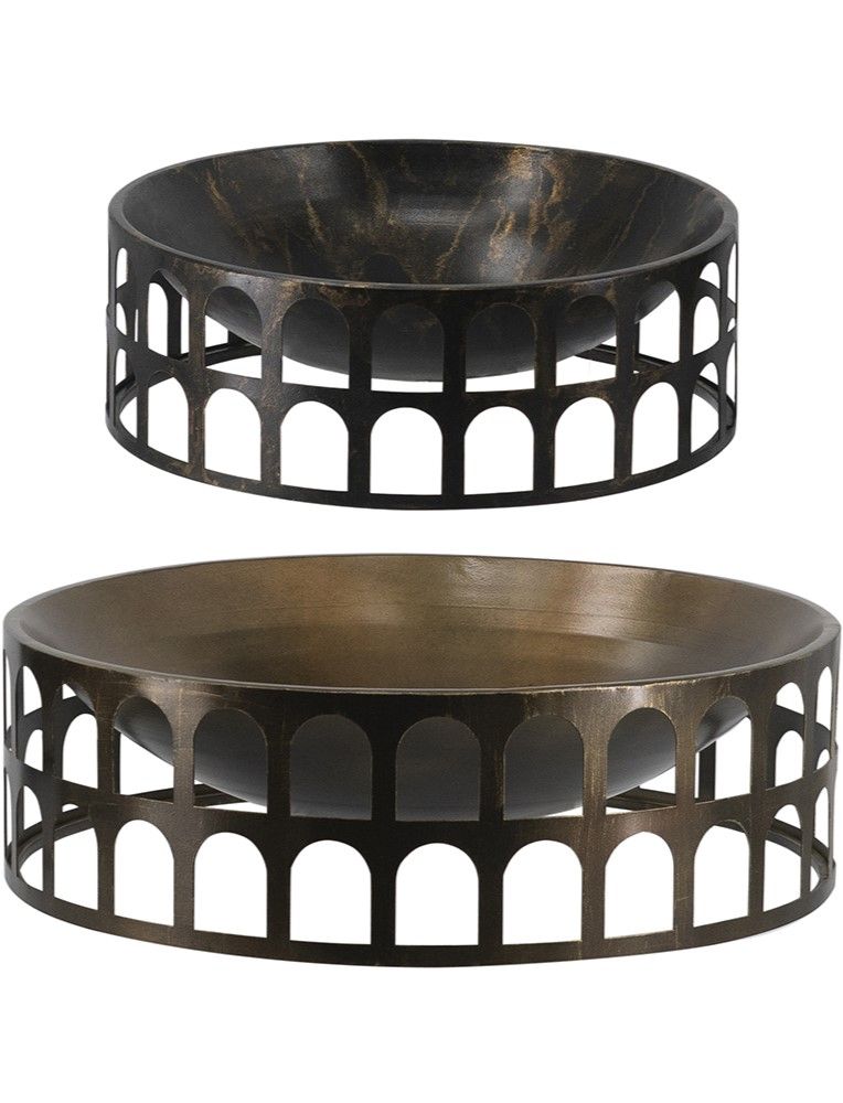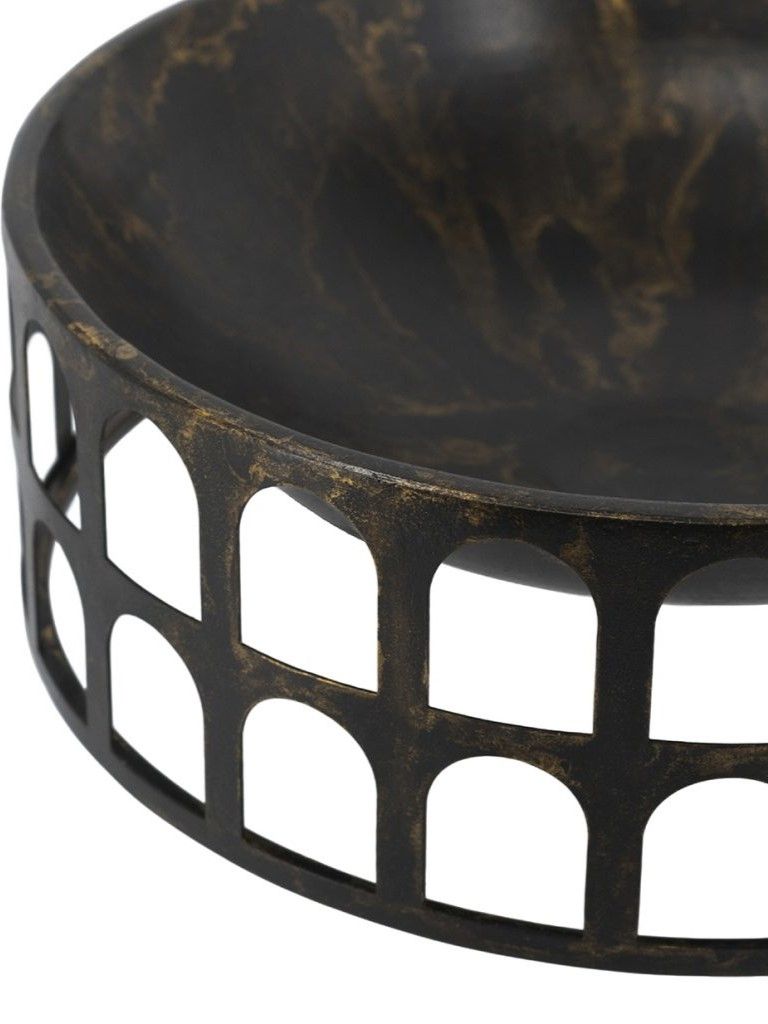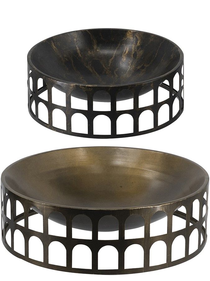 Декоративные чаши, вдохновленные величественной красотой римской архитектуры, отличаются широким округлым силуэтом, основанием с вырезанными арочными узорами и эффектным сочетанием золотисто-черных тонов. Каждый поднос изготовлен из прочного железа, отличается долговечностью и простотой в уходе, что позволяет изделиям быть практичным дополнением к любому интерьеру гостиной, прихожей или кухни. Цветовая гамма и симметричный дизайн позволяют этой паре дополнять традиционный, индустриальный, арт-деко и гламурный стили, органично вписываясь в любую обстановку или становясь центральным элементом декора.