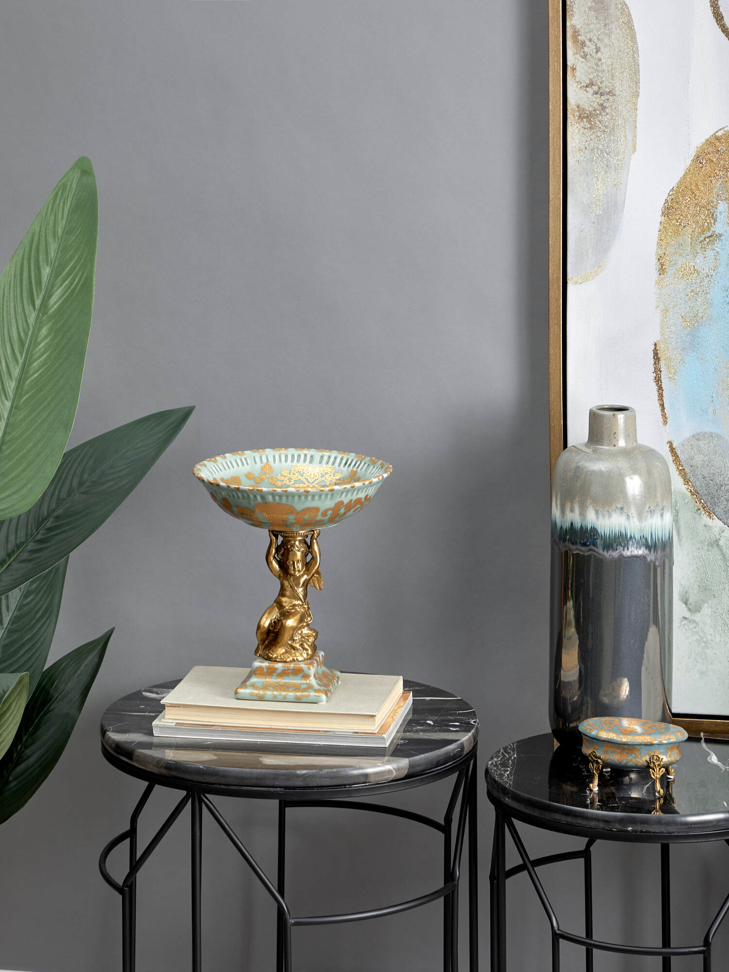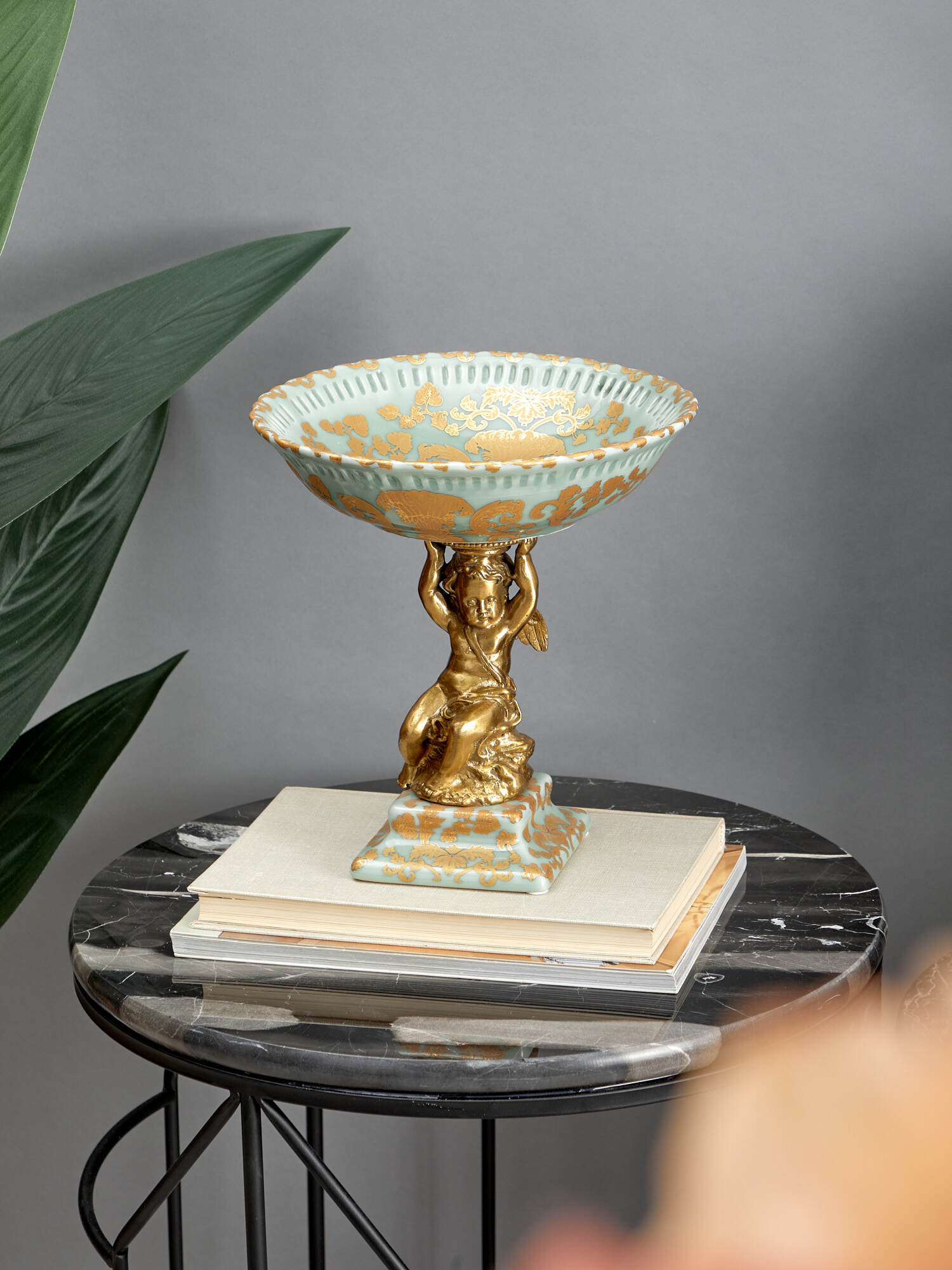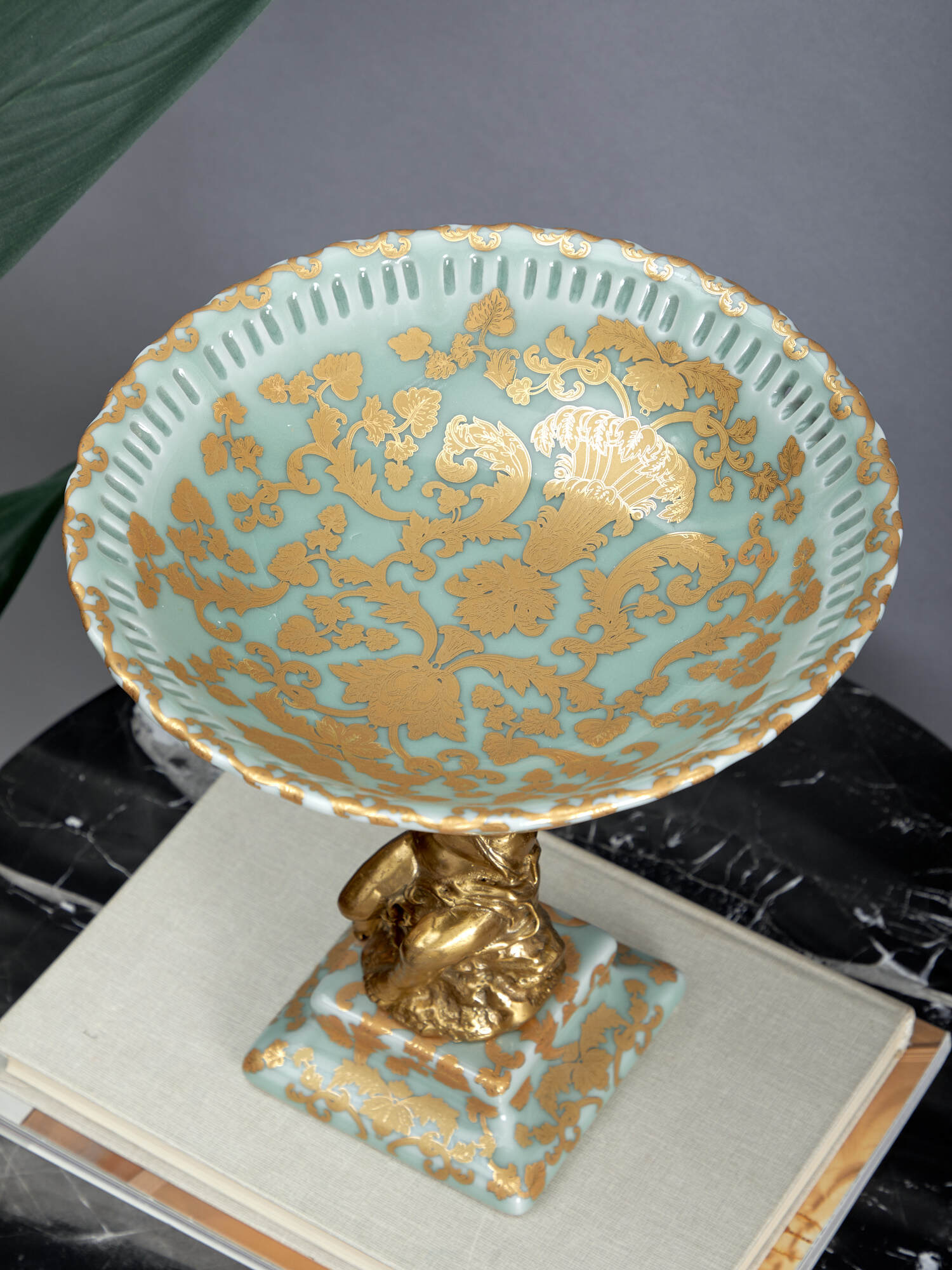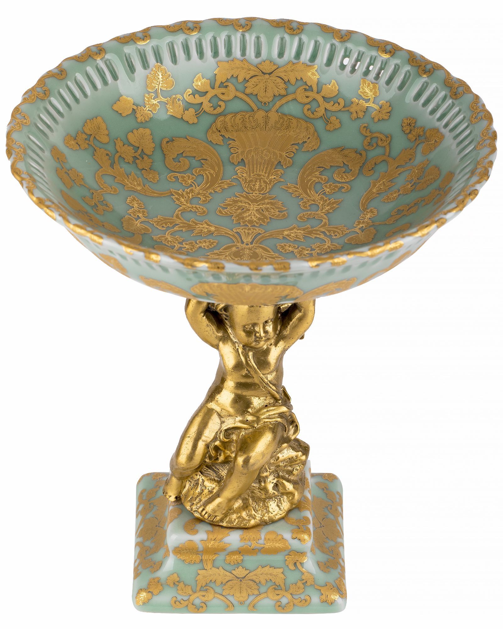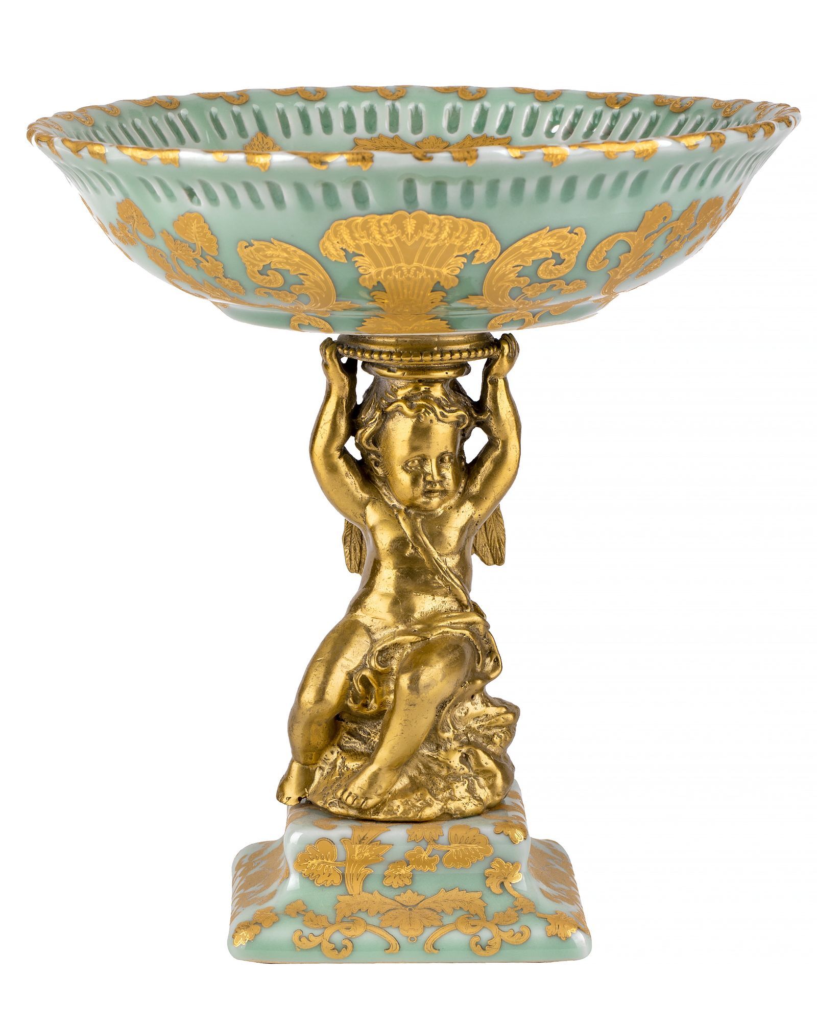 Чаша на ангеле, выполненная из фарфора с бронзовыми элементами. Уникальное изделие ручной работы. При производстве этих художественных изделий из фарфора с бронзой используются вековые традиции китайских мастеров. Видимые трещинки (кракелюры) делаются по уникальной технологии, что придает более благородный вид старинного изделия.