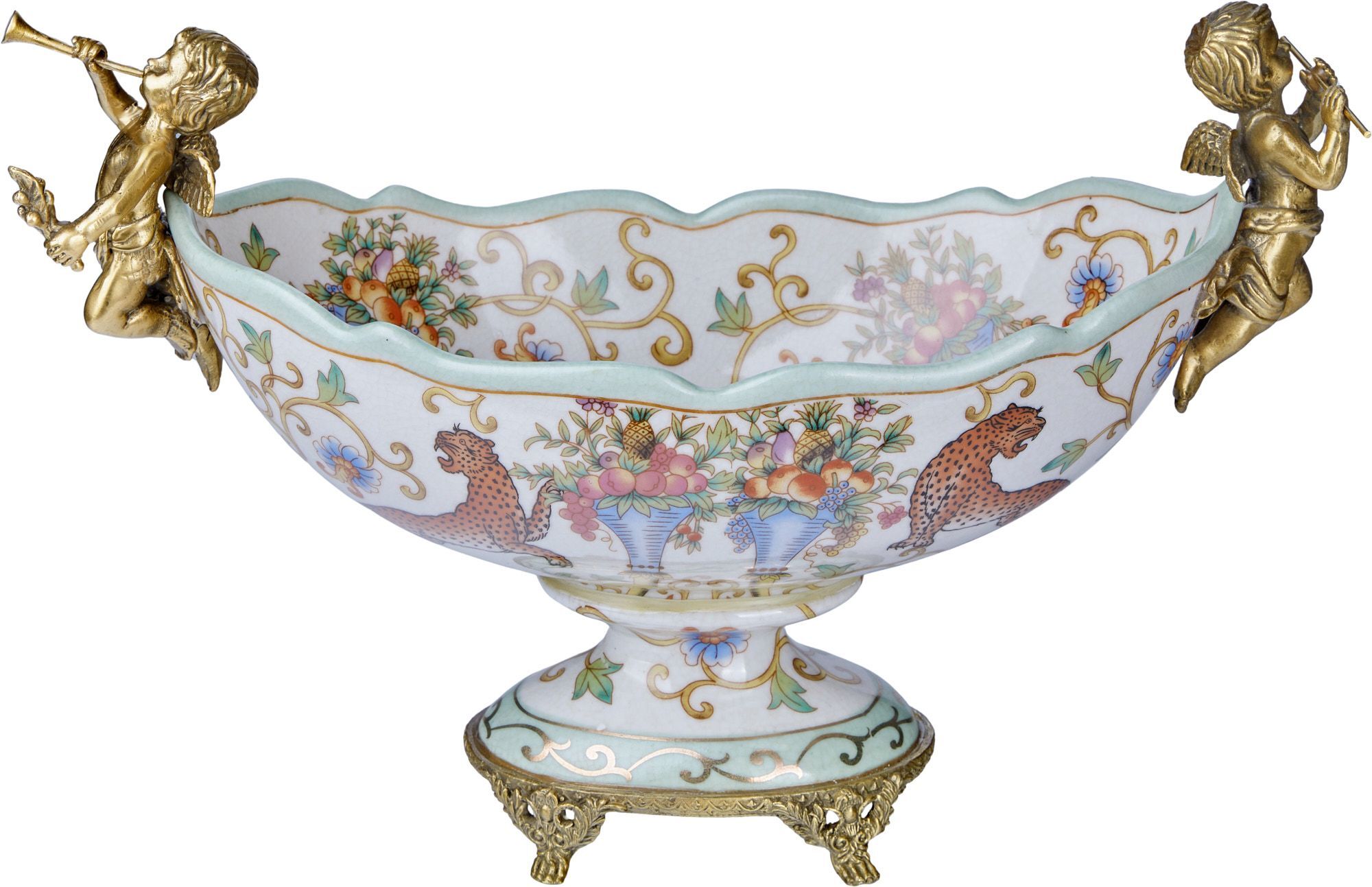 Чаша с ангелами, выполненная из фарфора с бронзовыми элементами. Уникальное изделие ручной работы. При производстве этих художественных изделий из фарфора с бронзой используются вековые традиции китайских мастеров. Видимые трещинки (кракелюры) делаются по уникальной технологии, что придает более благородный вид старинного изделия.