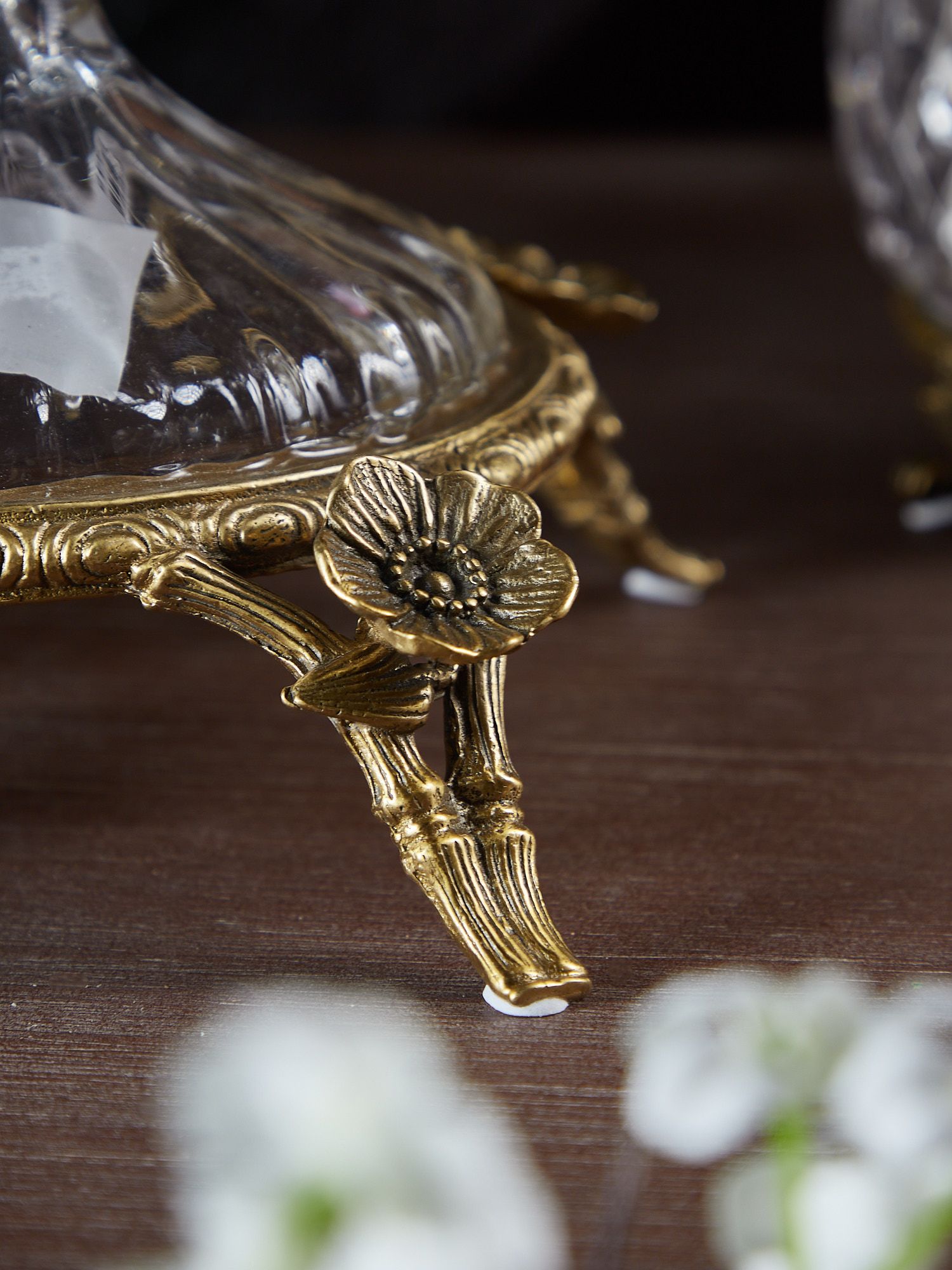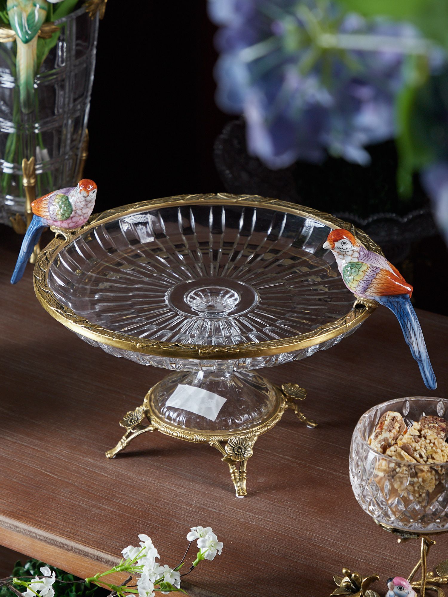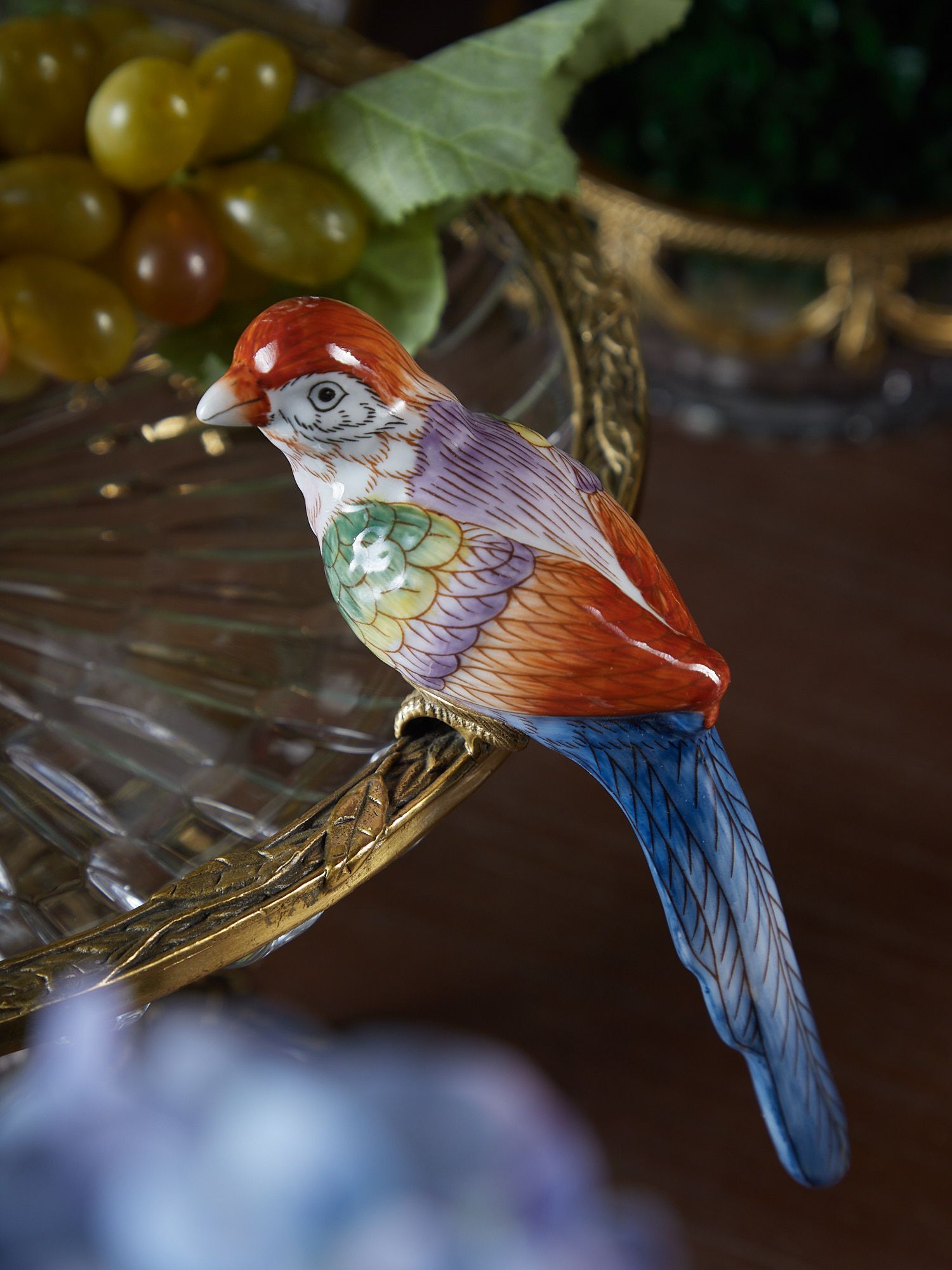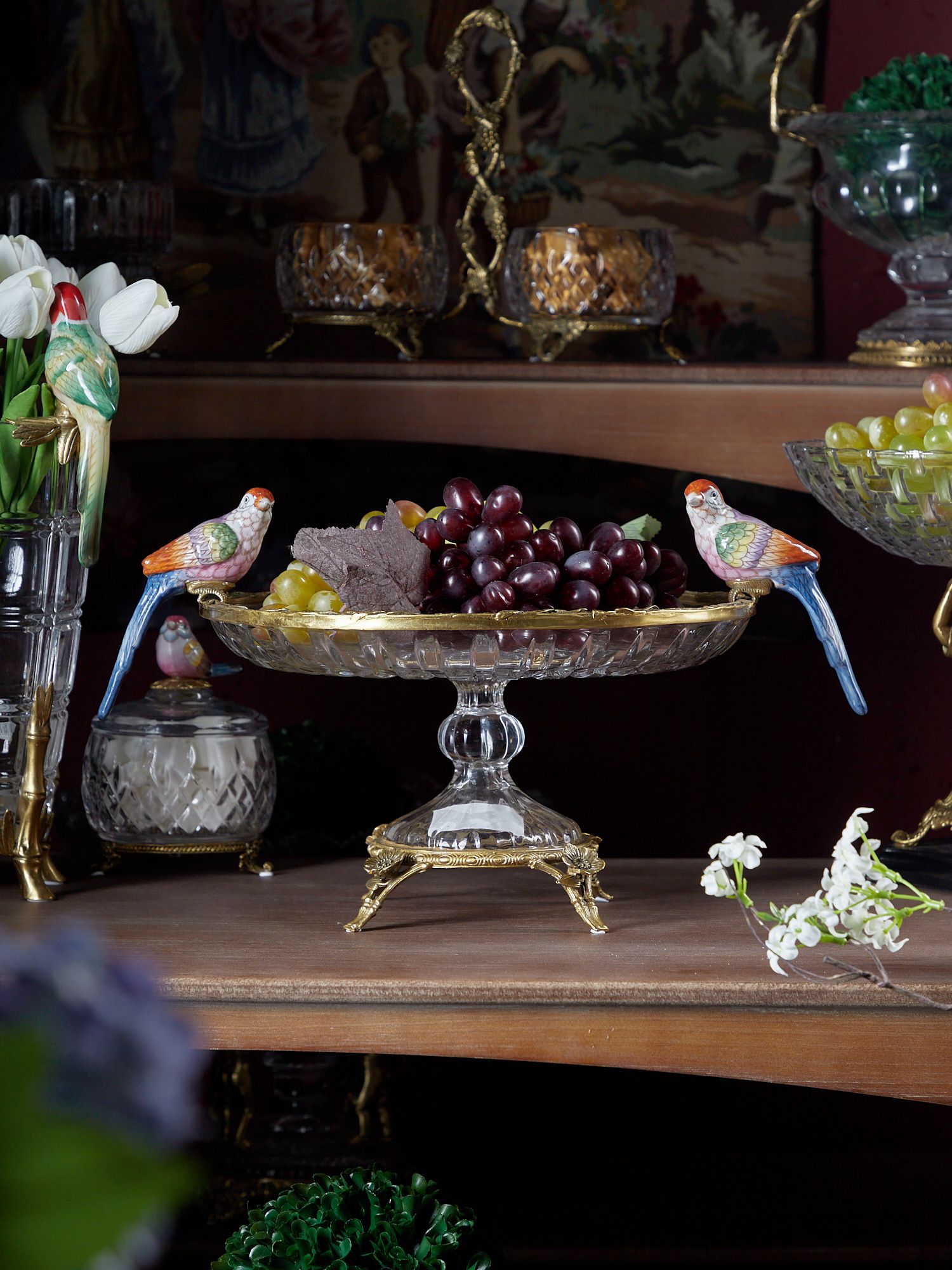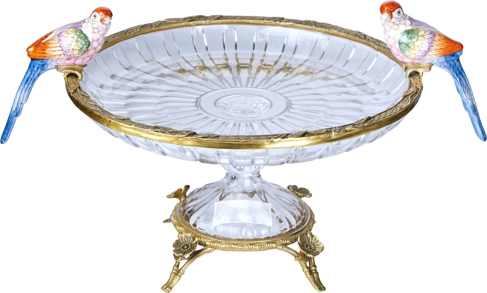 Изысканная чаша, декорированная фигурным подножием и ободком с фарфоровыми птицами, выполнена из стекла с бронзовыми элементами. Уникальное изделие ручной работы. При производстве этих художественных изделий из стекла используются вековые традиции китайских мастеров.