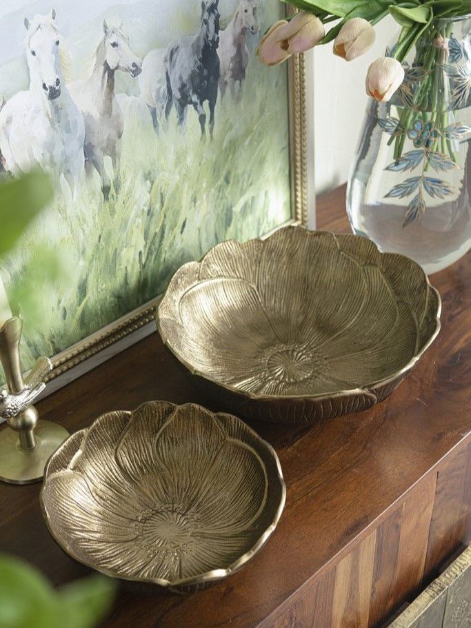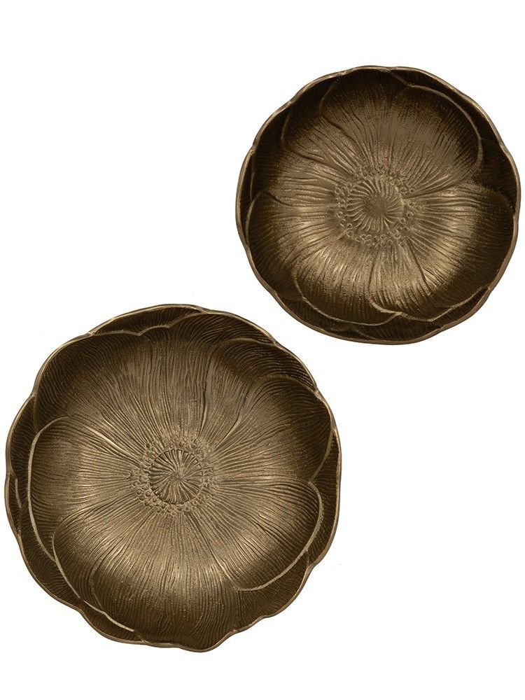 Каждая чаша из набора имеет текстурированный силуэт в виде распустившегося цветка магнолии, естественные рельефные края и отделку в золотистых оттенках. Используйте чаши в качестве декоративных подставок, стильных блюд для фруктов или для создания яркой центральной композиции. Органичный дизайн и теплая цветовая гамма позволяют этому набору дополнять стили кантри, бохо, арт-деко и другие, органично вписываясь в интерьер вашего дома.