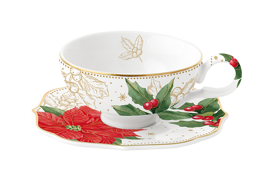 Пара кофейная, 1 перс, 2 пр, 120 мл, фарфор P, белая, с золотистым кантом, Пуансеттия и ягоды, Poinsettia and berries