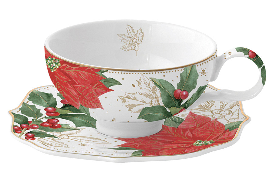 Пара чайная, 1 перс, 2 пр, 250 мл, фарфор P, белая, с золотистым кантом, Пуансеттия и ягоды, Poinsettia and berries