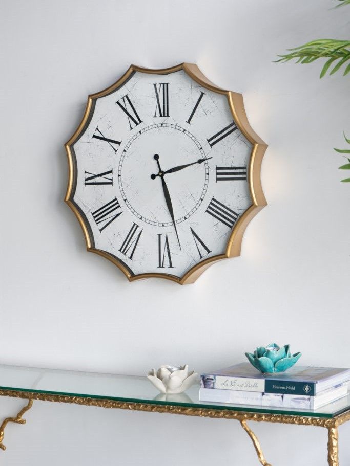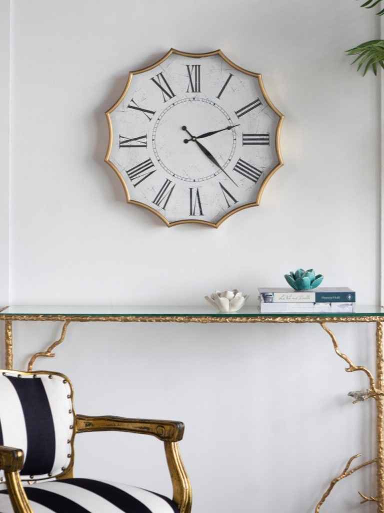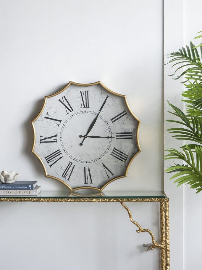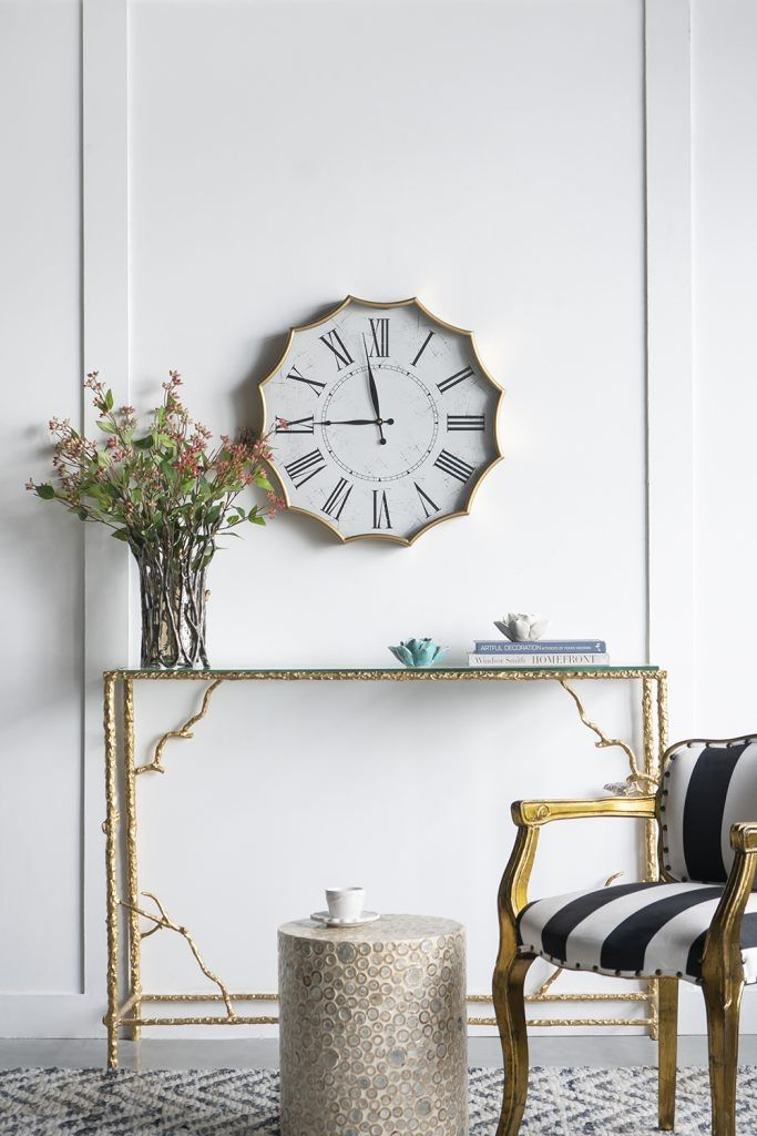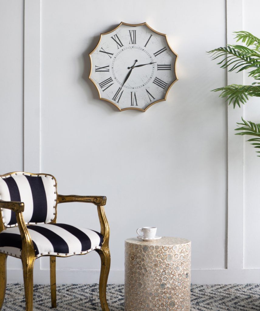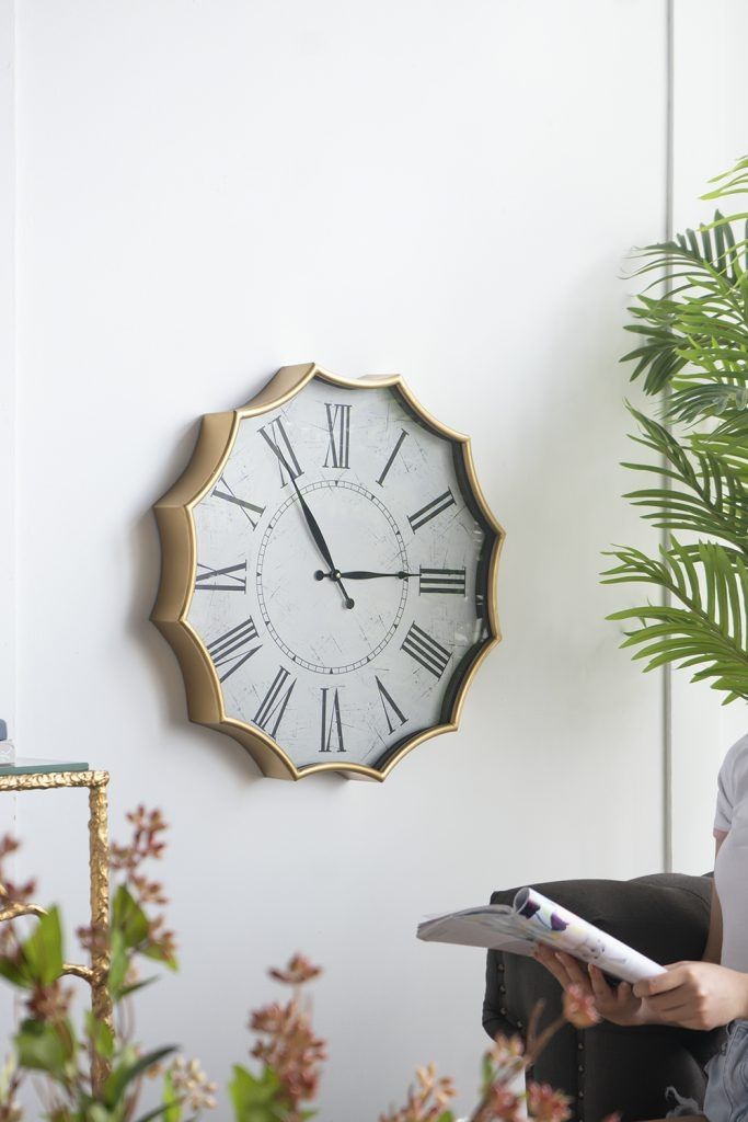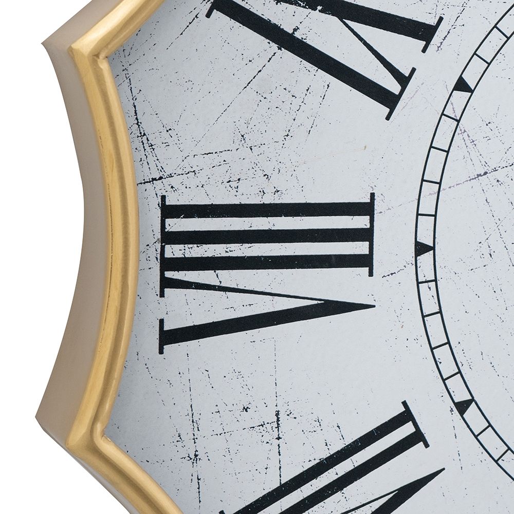 Круглые часы выполнены в бело-золотой цветовой гамме и дополнены фигурным обрамлением. Это изделие станет стильным решением для интерьера вашего дома. Разместите часы на стене в просторной гостиной, в спальной комнате или над барной стойкой, чтобы подчеркнуть важность времени в вашем доме.
