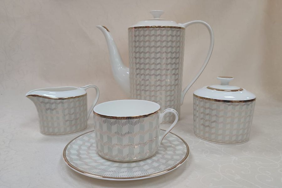 Сервиз чайный, 6 перс, 21 пр, фарфор F, молочно-серый, с золотистым кантом, Зигзаг, Alcazar