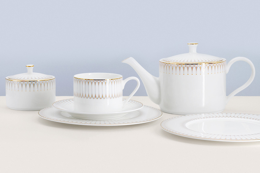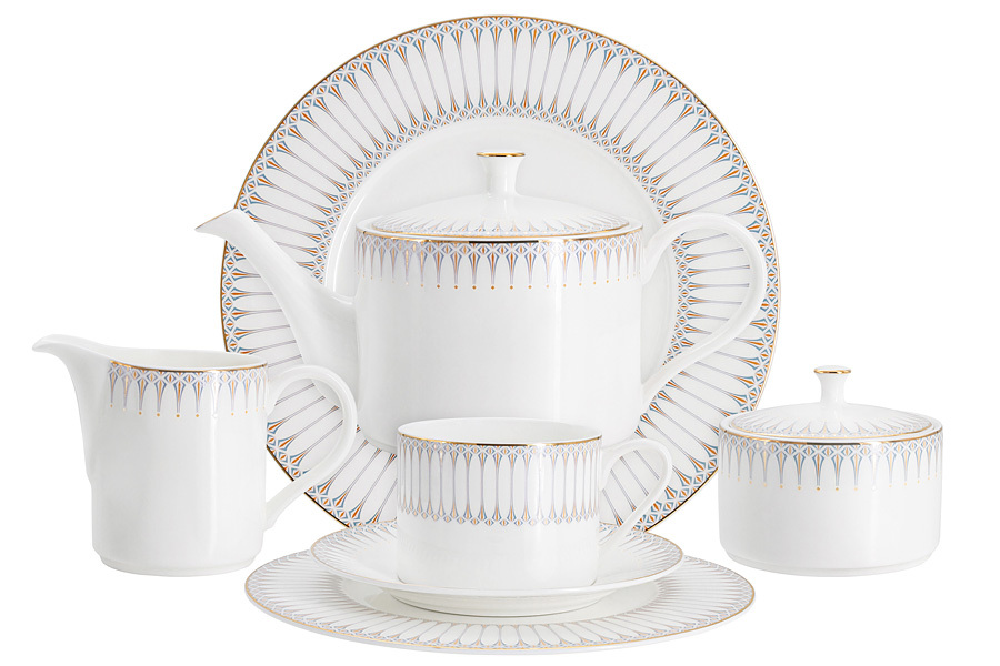 12 чашек 0,22 л, 12 блюдец 15,5 см, 12 тарелок 21 см, 1 чайник 0,75 л, 1 сахарница 0,25 л, 1 молочник 0,28 л, 1 блюдо для торта 27 см