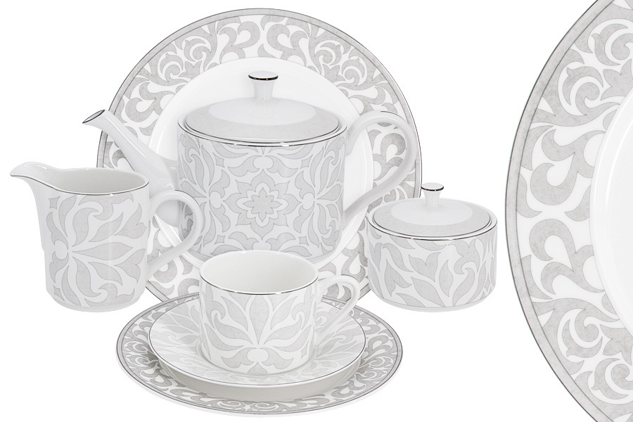 Сервиз чайный, 12 перс, 40 пр, фарфор F, бело-серый, с серебристым кантом, Узор, Isadora