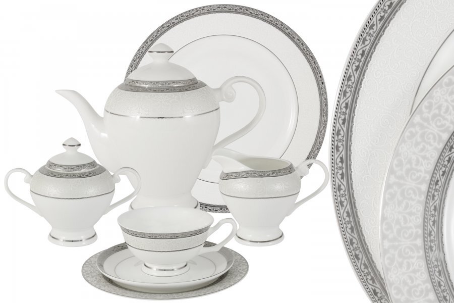 Сервиз чайный, 12 перс, 40 пр, фарфор F, бело-серый, с серебристым кантом, Арабеска, Boston