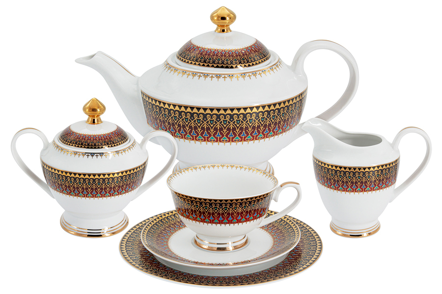 6 чашек 0,2 л, 6 блюдец, 6 тарелок 19 см, чайник с крышкой 1,4 л, сахарница с крышкой 0,45 л, молочник 0,3 л
