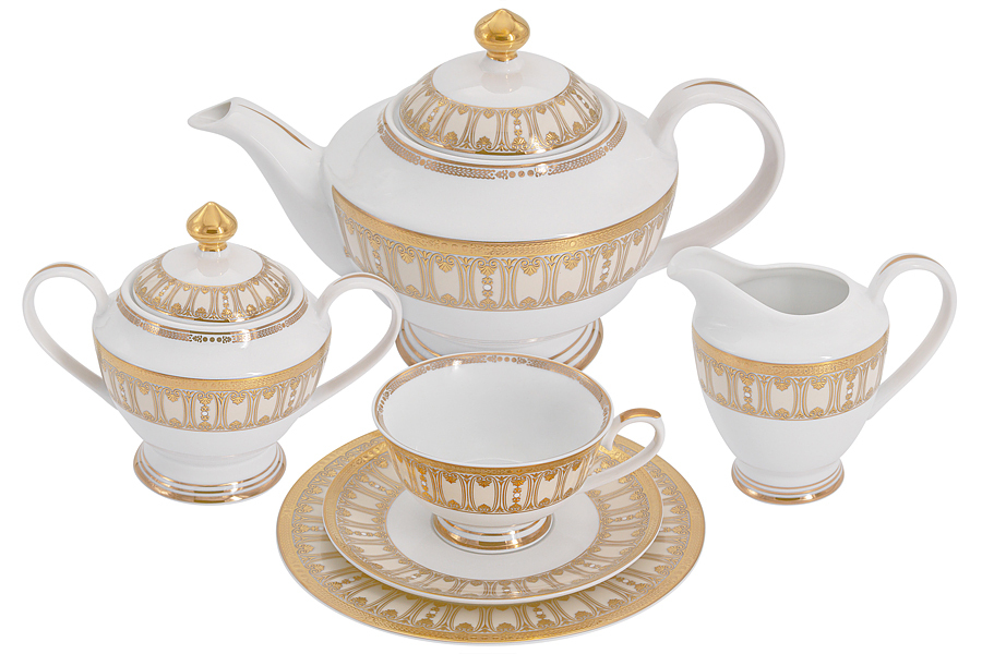 6 чашек 0,2 л, 6 блюдец, 6 тарелок 19 см, чайник с крышкой 1,4 л, сахарница с крышкой 0,45 л, молочник 0,3 л