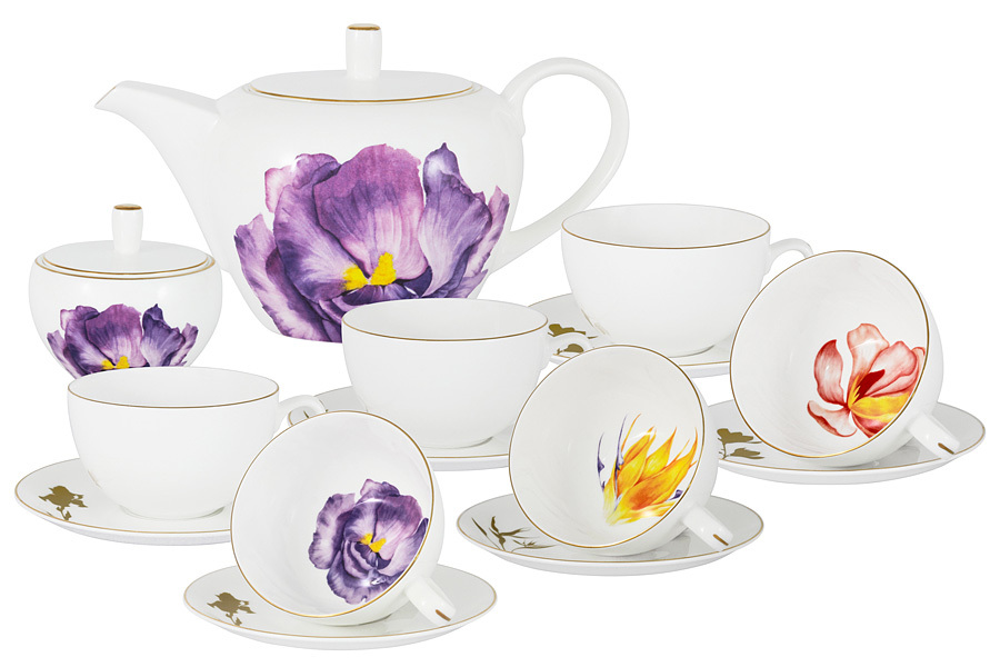 Сервиз чайный, 6 перс, 14 пр, фарфор F, бело-фиолетовый, с золотистым кантом, Микс, Flowers