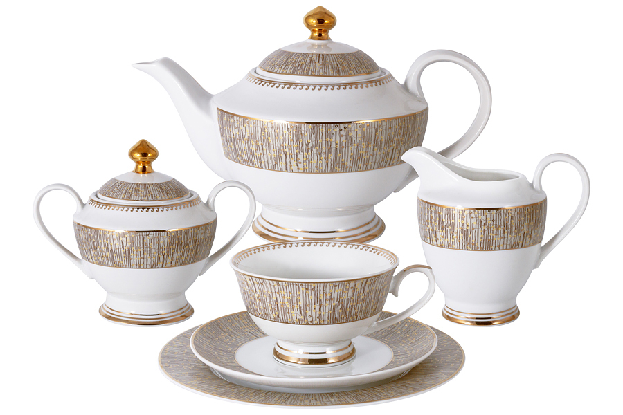 Сервиз чайный, 6 перс, 23 пр, фарфор P, бело-серый, с золотистым орнаментом, Luxor