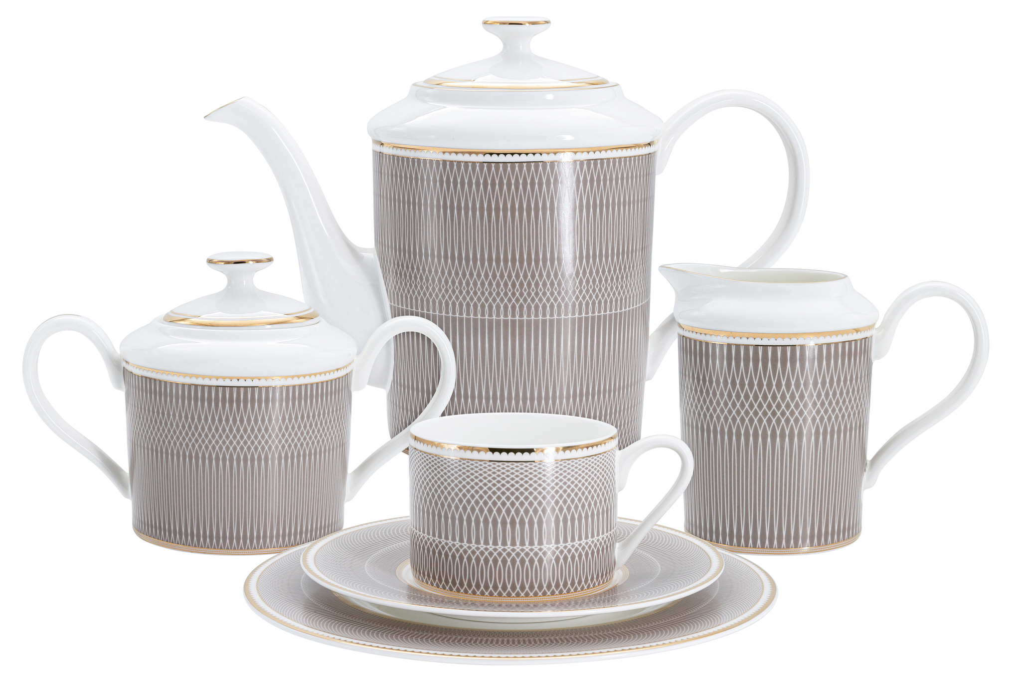6 чашек 0,22л, 6 блюдец 17 см, 6 тарелок 21см, чайник 1,25 л, сахарница 0,48 л, молочник 0,38 л