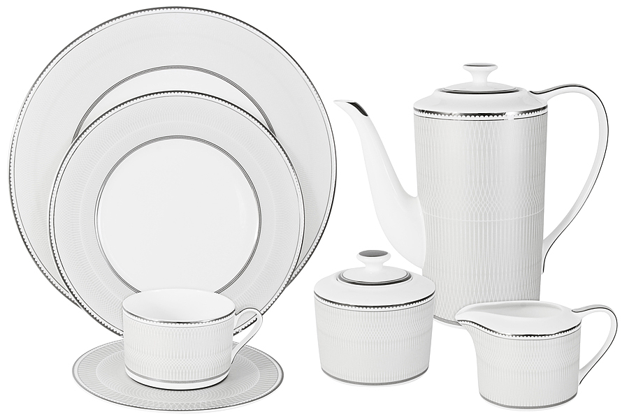 12 чашек 0,25 л ,12 блюдец 17 см,12 закусочных тарелок 21,5 см, чайник 1,4 л ,сахарница 0,35 л ,молочник 0,25 л , блюдо для торта 31см