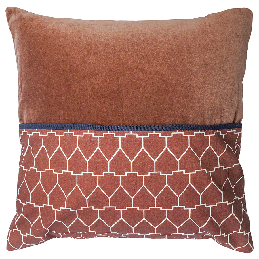 "Чехол на подушку из хлопкового бархата с геометрическим принтом терракотового цвета из коллекции Ethnic добавит уюта интерьеру гостиной и спальни. Лицевая сторона состоит из принтованной и однотонной частей, поэтому изделие легко сочетать с любым другим декоративным текстилем. Нежный, приятный на ощупь хлопковый бархат прост в уходе и не электризуется. Застёжка – потайная молния в боковом шве.