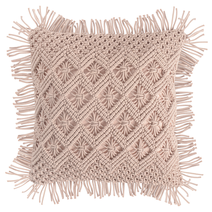 "Чехол на подушку макраме с бахромой цвета пыльной розы из коллекции Ethnic добавит этнические мотивы в любой интерьер. Объемный узор на лицевой стороне выполнен в технике макраме, по периметру отделка густой бахромой. Изделие легко сочетается с другим текстилем благодаря своей однотонности и пастельной гамме. Чехол изготовлен из прочного, плотного 100%, хлопка, который не электризуется. Застёжка – потайная молния в боковом шве.