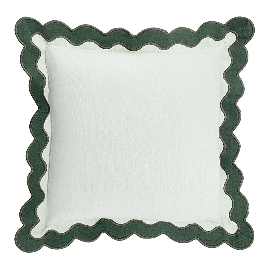 "Чехол на подушку с контрастным кантом зеленого цвета из коллекции Trendy Ruffles привнесет свежий акцент в оформление гостиной, спальни или зоны отдыха. Текстиль с волнистой отделкой, напоминающей изящные раковины морских гребешков, стал ярким элементом стиля Ар Деко – и сейчас возвращается в моду, появляясь в самых актуальных интерьерных решениях.