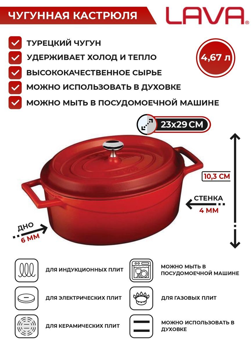 Чугунная эмалированная кастрюля овальная 4,67 л, 23х29 см, красный