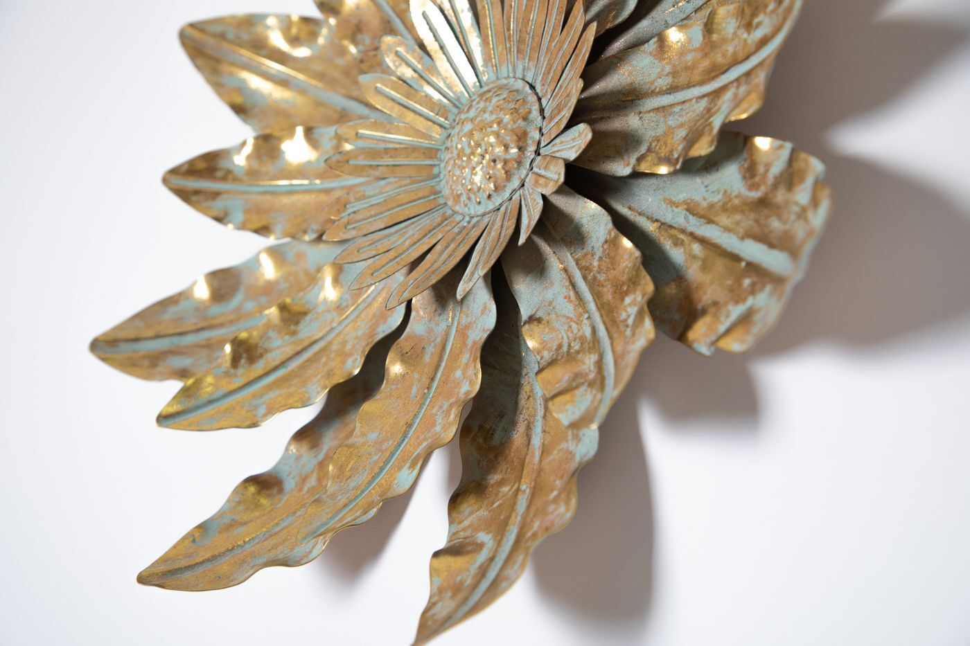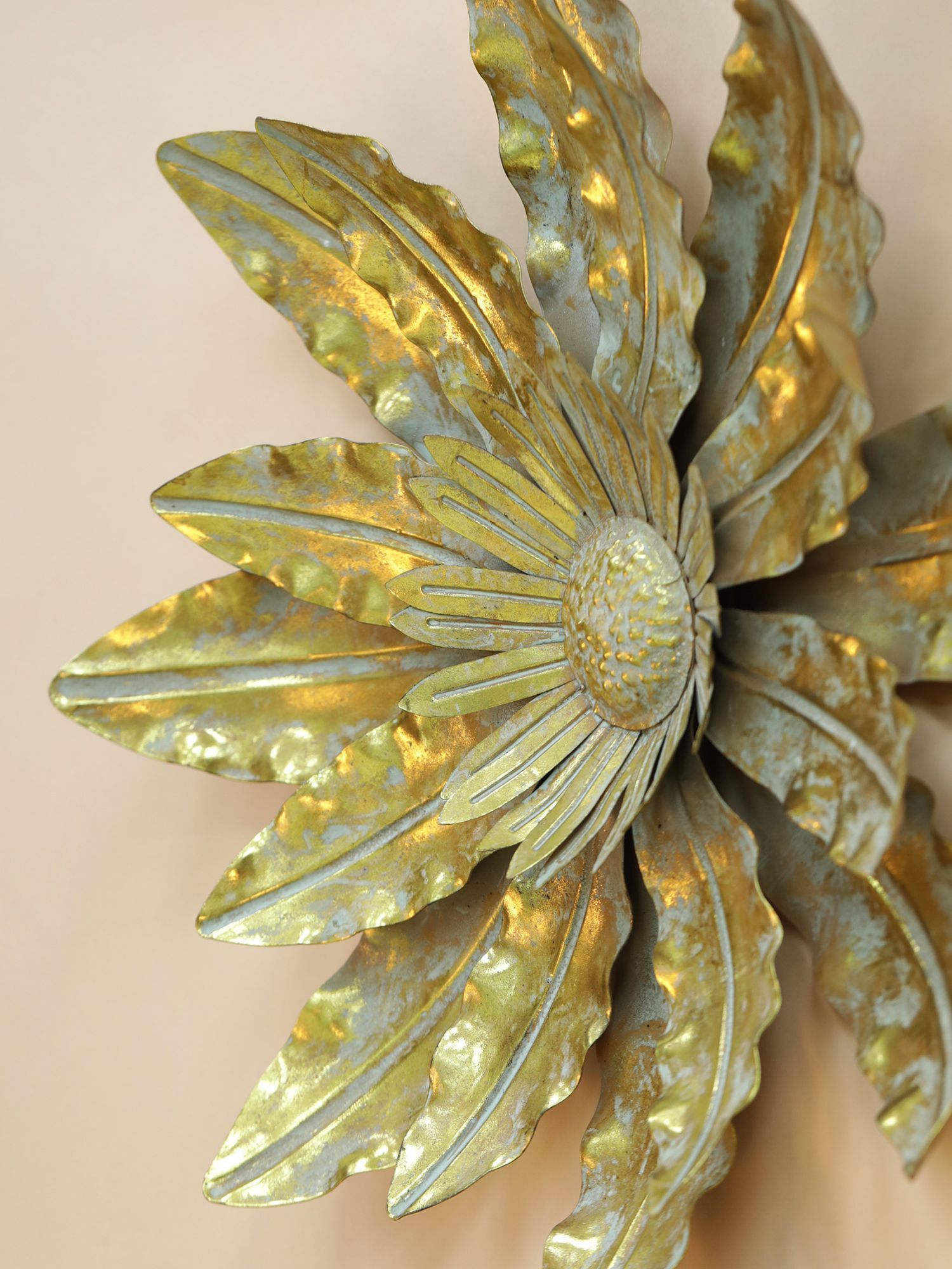 Благодаря блестящей золотой отделке и необычному дизайну это панно легко украсит собой любое пространство. Изделие имеет признаки искусственного состаривания, поверхность декорирована с эффектом патинирования, а наличие сварочных фрагментов подчеркивают принадлежность к ручной работе. Оживите вашу стену с этим элементом декора, который идеально подходит для вашего дома или офиса.