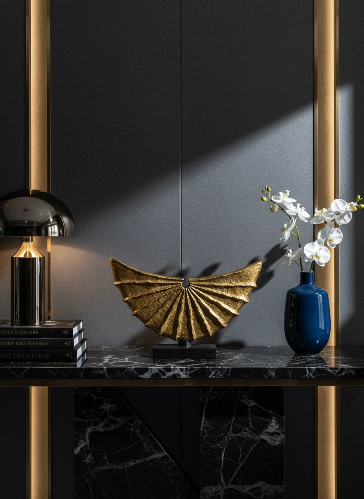 Яркий настольный акцент в виде расправленных крыльев летучей мыши, создает образ совершенного полета. Летучие мыши в китайской мифологии считались символами удачи, способными отогнать злых духов и призраков, а также символами находчивости и мудрости, из-за умения ориентироваться в темноте. Созданные в золотистом оттенке с точностью и художественными линиями, изделие придаст индивидуальность любой поверхности стола или полке.