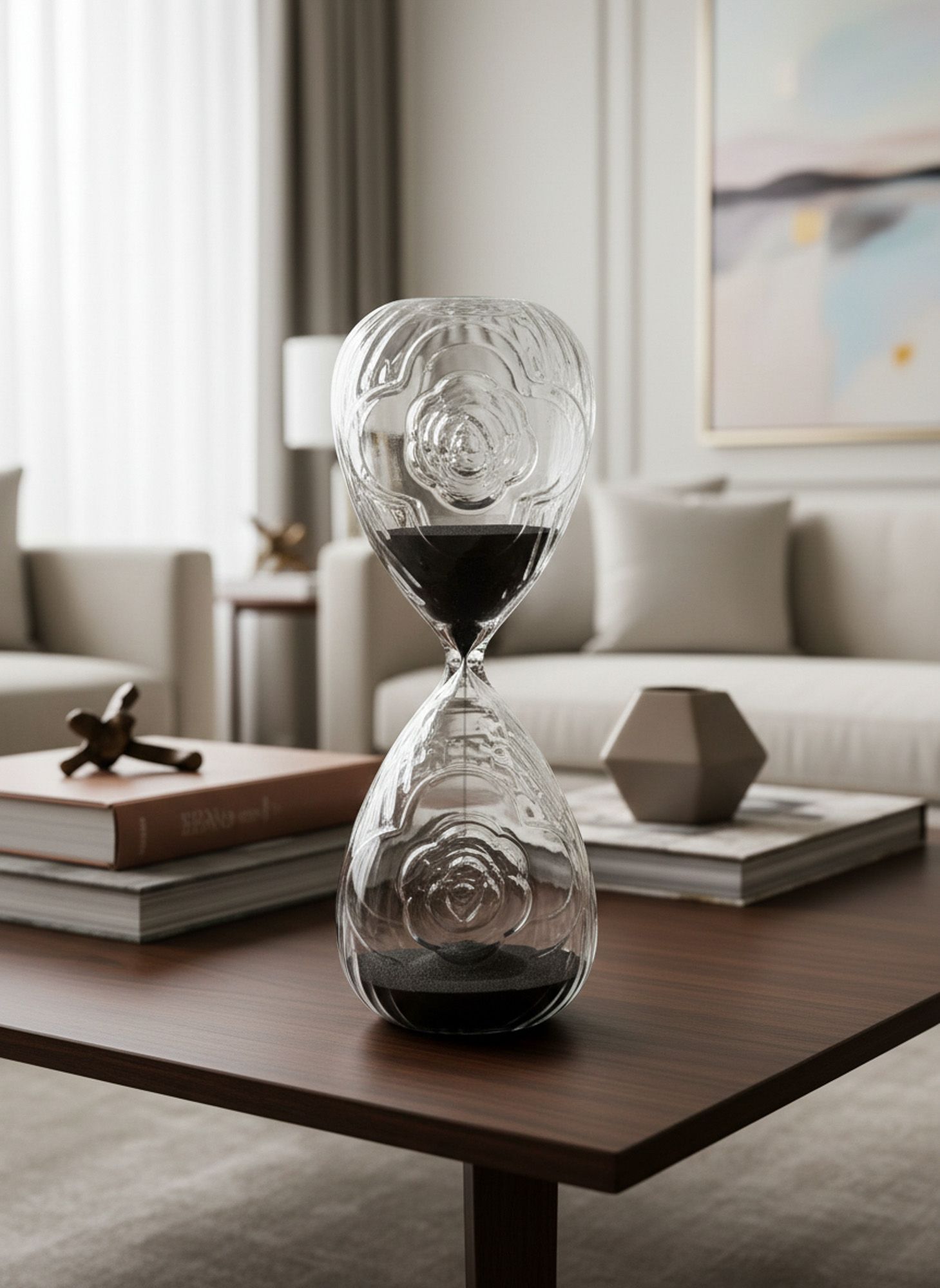 Песочные часы, как неповторимый предмет интерьера, служат постоянным напоминанием о том, что время неподвластно никому. Это изделие восхищает своим прозрачным корпусом и рельефным узором на стекле в виде розы, а также восхищает песочным блеском черного цвета, погружая в релаксацию и приятные воспоминания. Песочные часы рассчитаны на 30 минут.