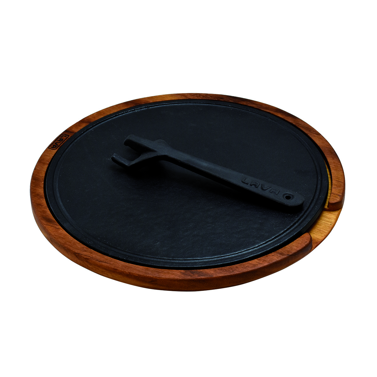 Деревянный поднос с чугунным блюдом(ø)29cm. (4 pieces silicon seperater between wood and plate)