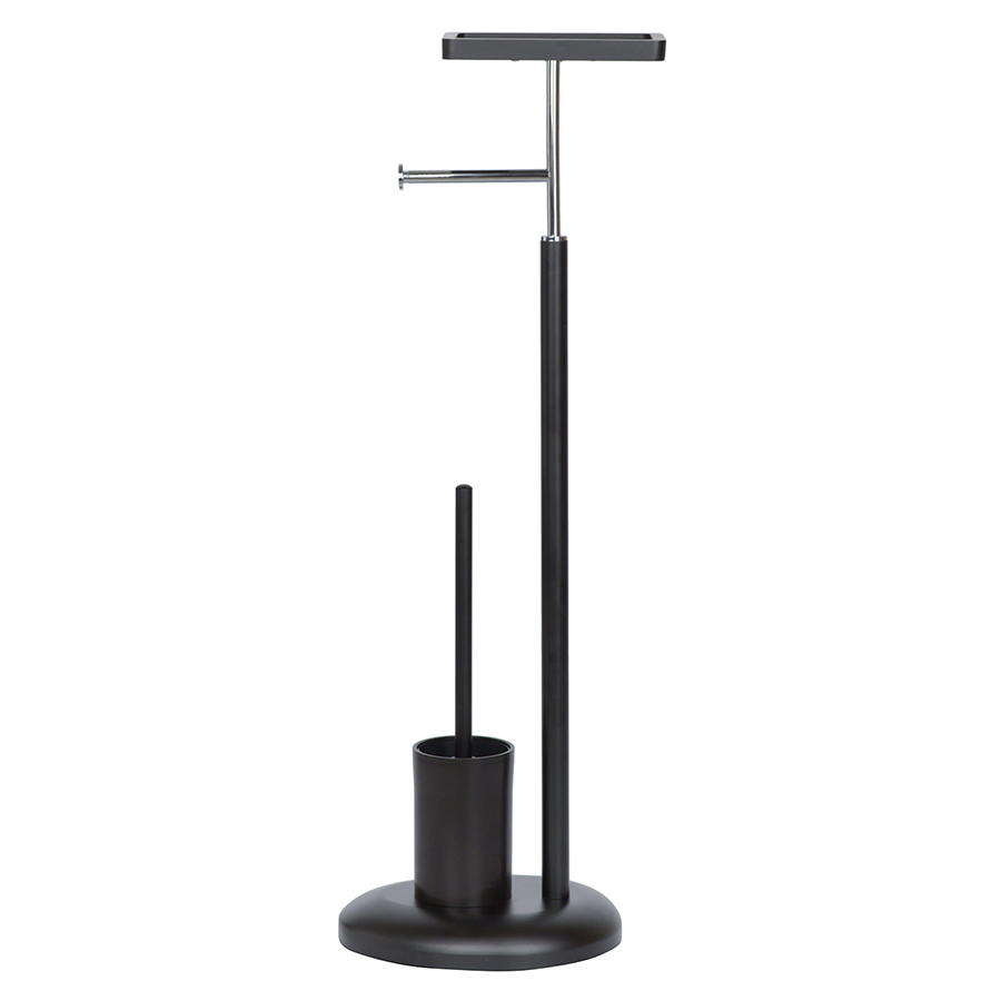 "Стенд для туалетной бумаги с ершиком и полкой Salvucci – многофункциональный аксессуар для санузла. На стойке располагаются держатель для рулонов, туалетный ершик и полочка для мобильного телефона или других мелочей. Стенд выполнен в строгом лаконичном стиле, прекрасно вписывается в любой современный интерьер. Влагостойкое покрытие защищает металл от коррозии, сохраняет привлекательность весь срок службы изделия. Прочная конструкция устойчива к механическим воздействиям и проста в уходе. Стальное основание обеспечивает хорошую устойчивость и не дает стойке опрокинуться.