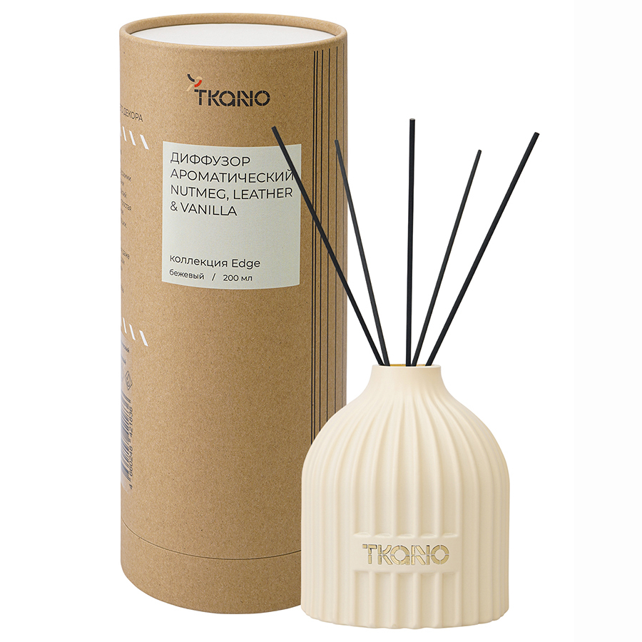 "Диффузор ароматический Nutmeg, Leather & Vanilla бежевого цвета из коллекции Edge с дизайном, вдохновленным русскими традициями, отлично подойдет для домашнего декора и создания в интерьере уютной, расслабляющей атмосферы. Фактурные грани и округлая поверхность стеклянного флакона отсылают нас к образу купола – символу духовного подъема и стремления к совершенству. В комплект входят 10 фибровых палочек.