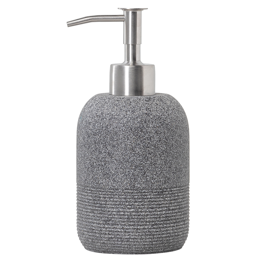 "Диспенсер для жидкого мыла Loup имеет корпус из полирезина, стилизованного под натуральный камень графитового оттенка.