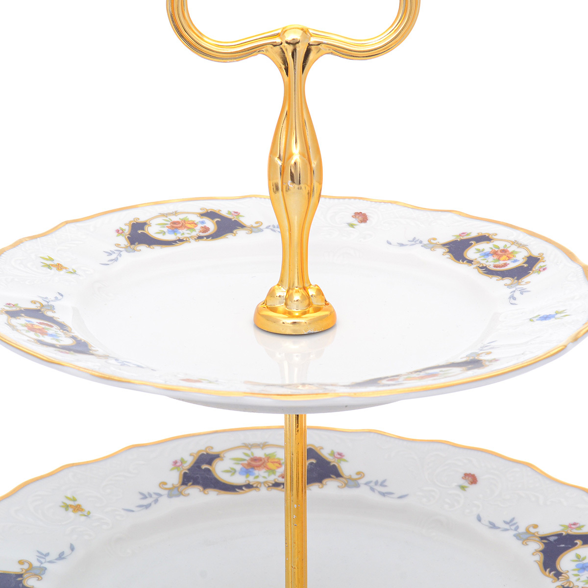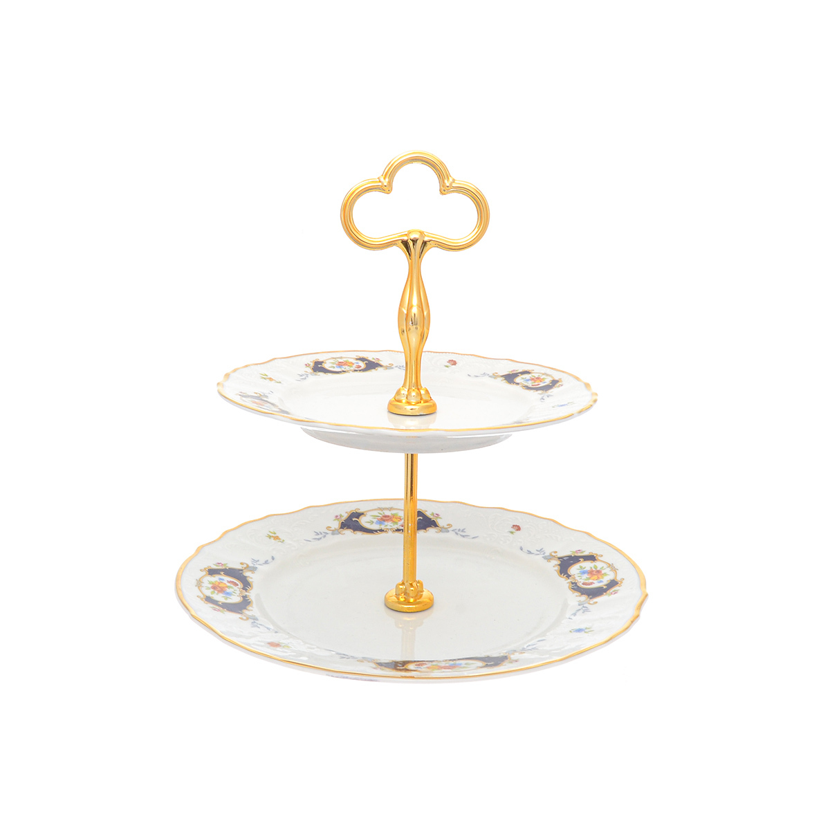 Этажерка (Горка) 2 яруса Бернадотт Синий глаз Изысканная и миниатюрная этажерка, вопреки небольшим размерам, позволит подать к столу сочные фрукты, конфеты, канапе и многие другие вкусности, не занимая при этом много места.