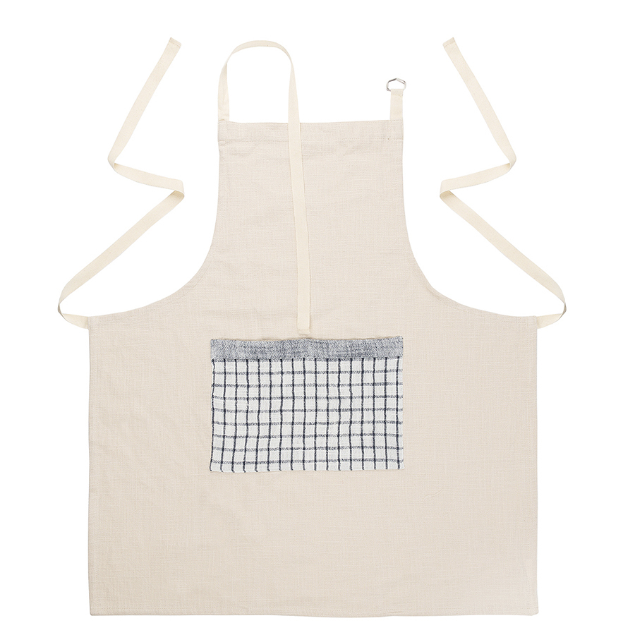 "Фартук из плотного хлопка с контрастным карманом в клетку из коллекции Essential защитит одежду во время готовки и работы на кухне. Модель украшена большим накладным карманом, бретель нагрудника регулируется по длине. Фартук в нейтральной цветовой гамме будет хорошо сочетаться с другим кухонным текстилем.