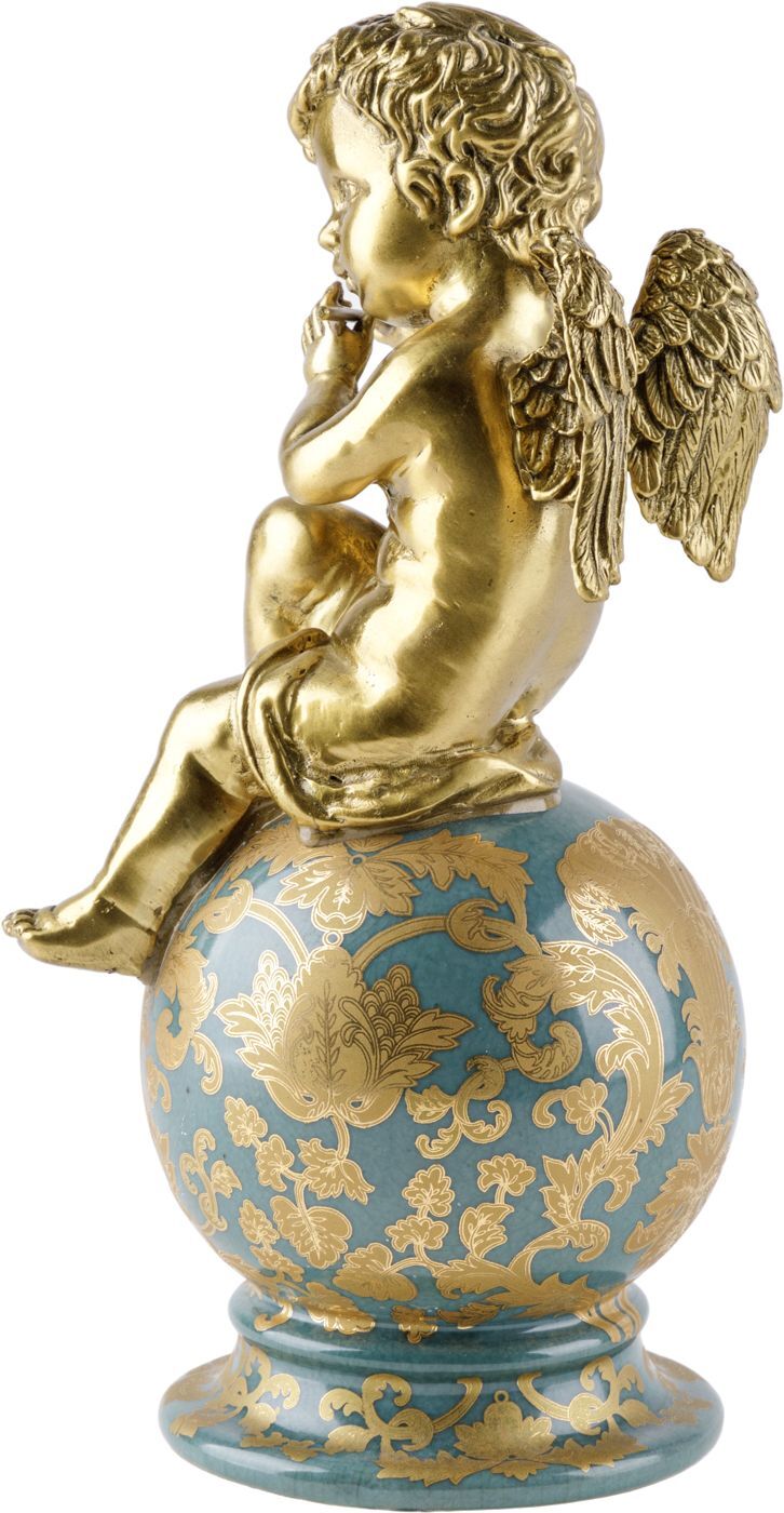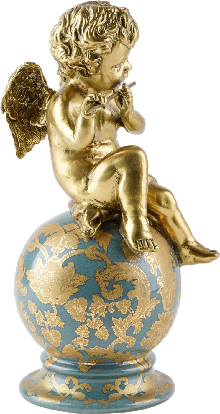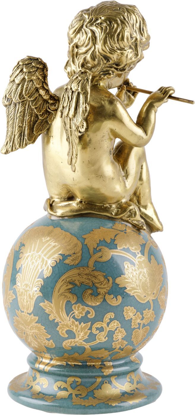 Изысканная фигурка в виде ангела на шаре, играющего на флейте, выполненная из фарфора с бронзовыми элементами. Уникальное изделие ручной работы. При производстве этих художественных изделий из фарфора с бронзой используются вековые традиции китайских мастеров. Видимые трещинки (кракелюры) делаются по уникальной технологии, что придает более благородный вид старинного изделия.