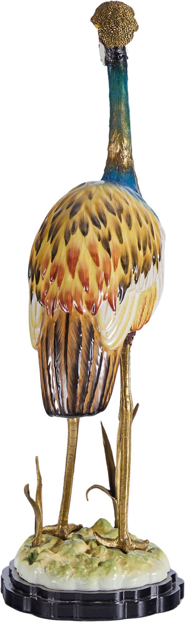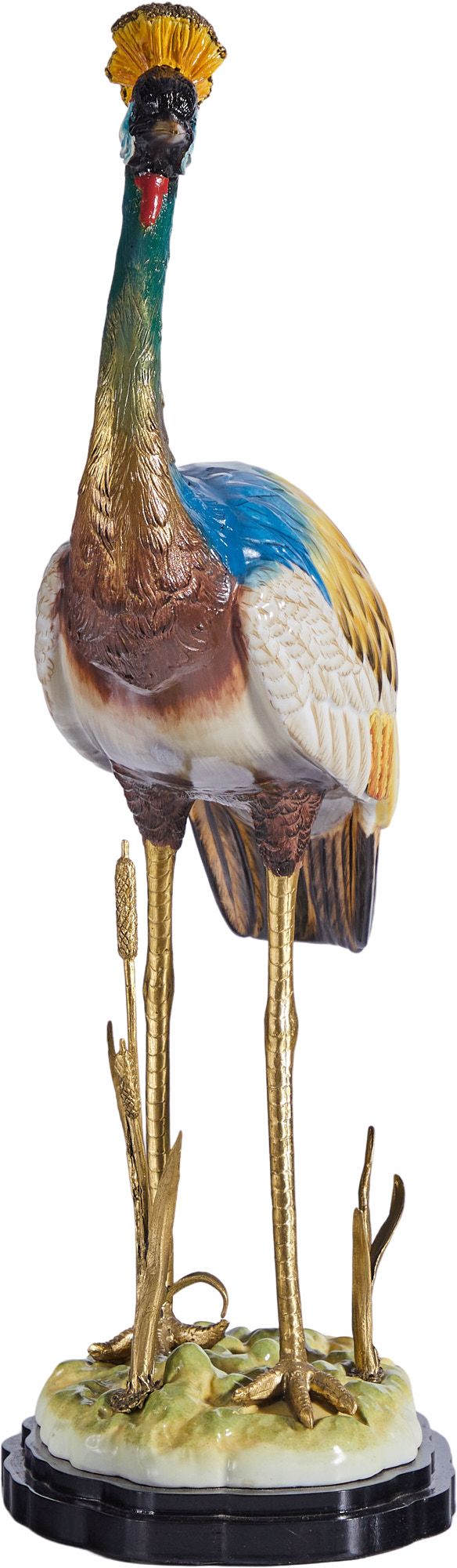 Настольный декор в виде венценосного журавля, выполненный из фарфора с бронзовыми элементами. Уникальное изделие ручной работы. При производстве этих художественных изделий из фарфора с бронзой используются вековые традиции китайских мастеров. Видимые трещинки (кракелюры) делаются по уникальной технологии, что придает более благородный вид старинного изделия.