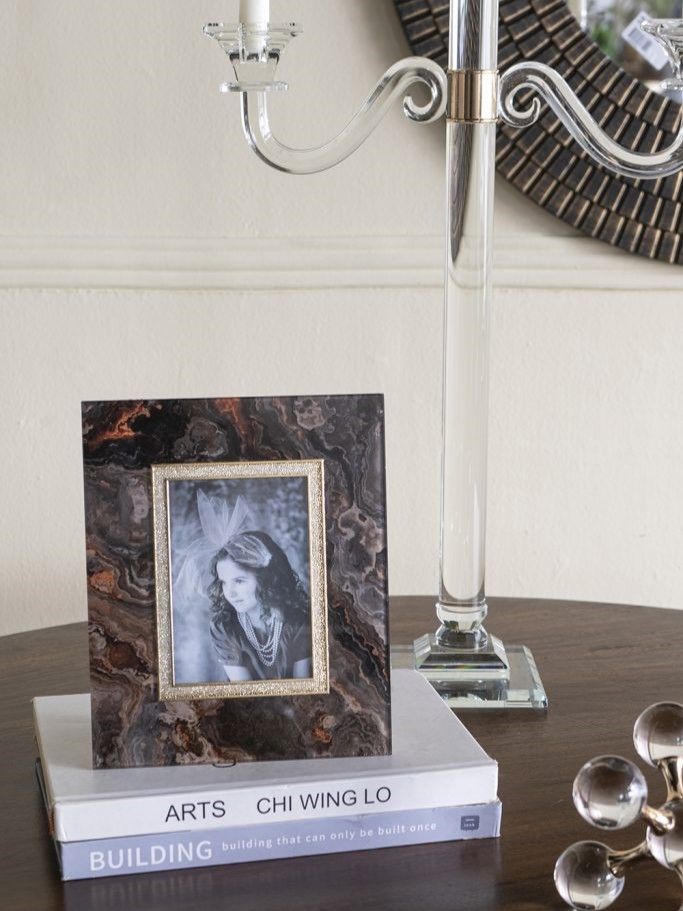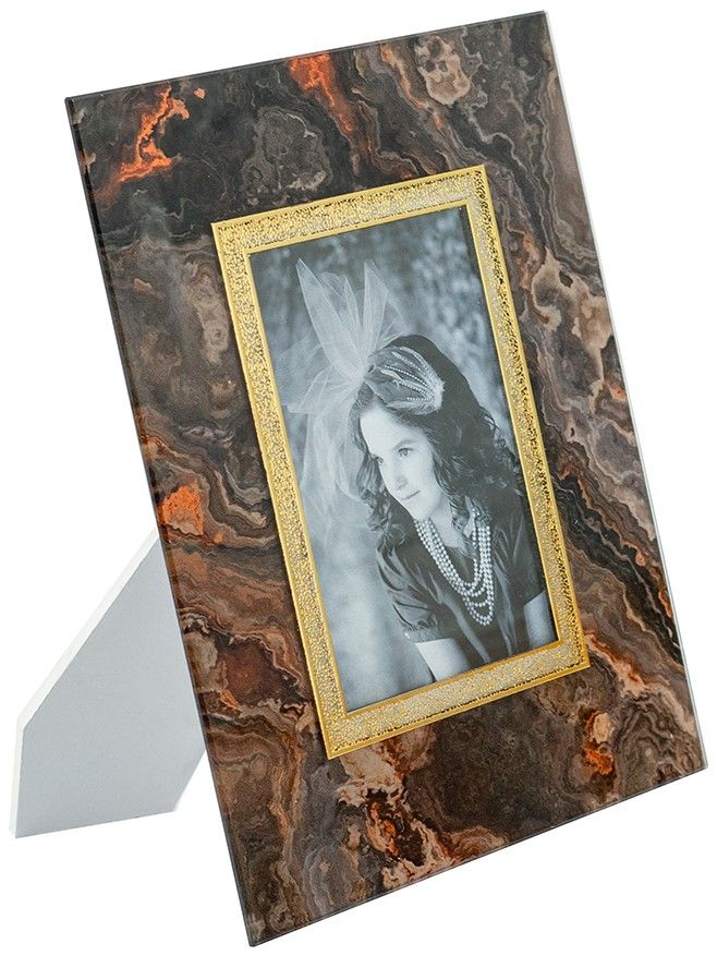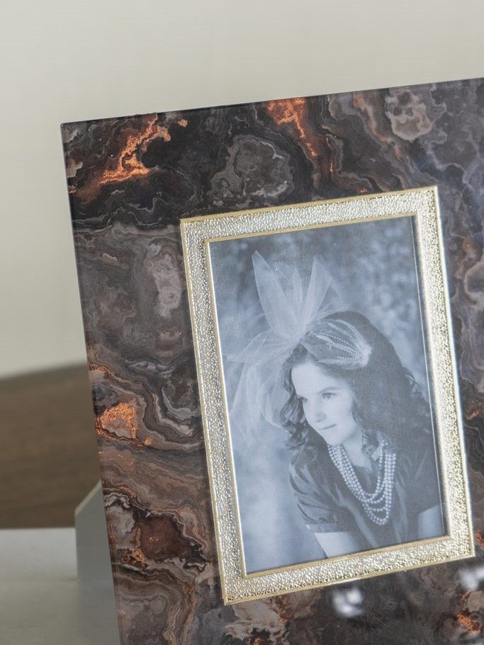 Красивая фоторамка, сочетающая в себе современный стиль и элементы абстрактного искусства, обладает прямоугольным силуэтом и текстурой под мрамор с насыщенными оттенками черного, медного и коричневого. Изделие можно поставить на прикроватную тумбу, каминную полку или стол, как напоминание о самых дорогих моментах. Абстрактные детали и насыщенные тона позволяют этой рамке для фотографий дополнять переходный, современный, эклектичный и индустриальный стили, благодаря чему изделие органично впишется в любой интерьер.