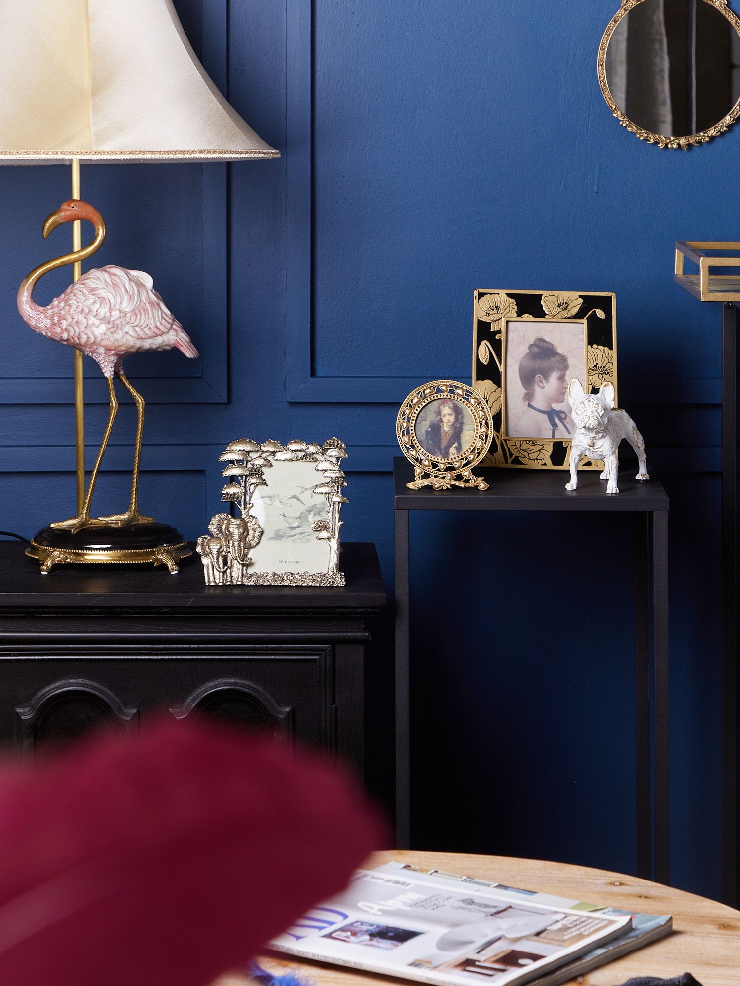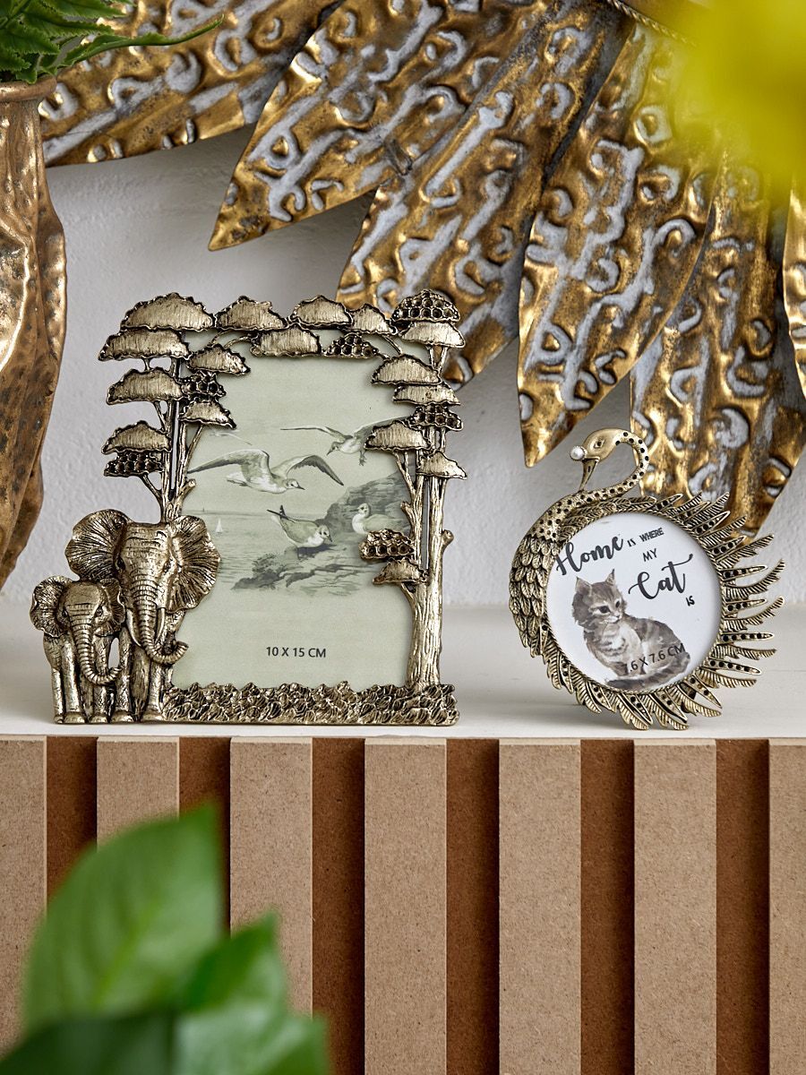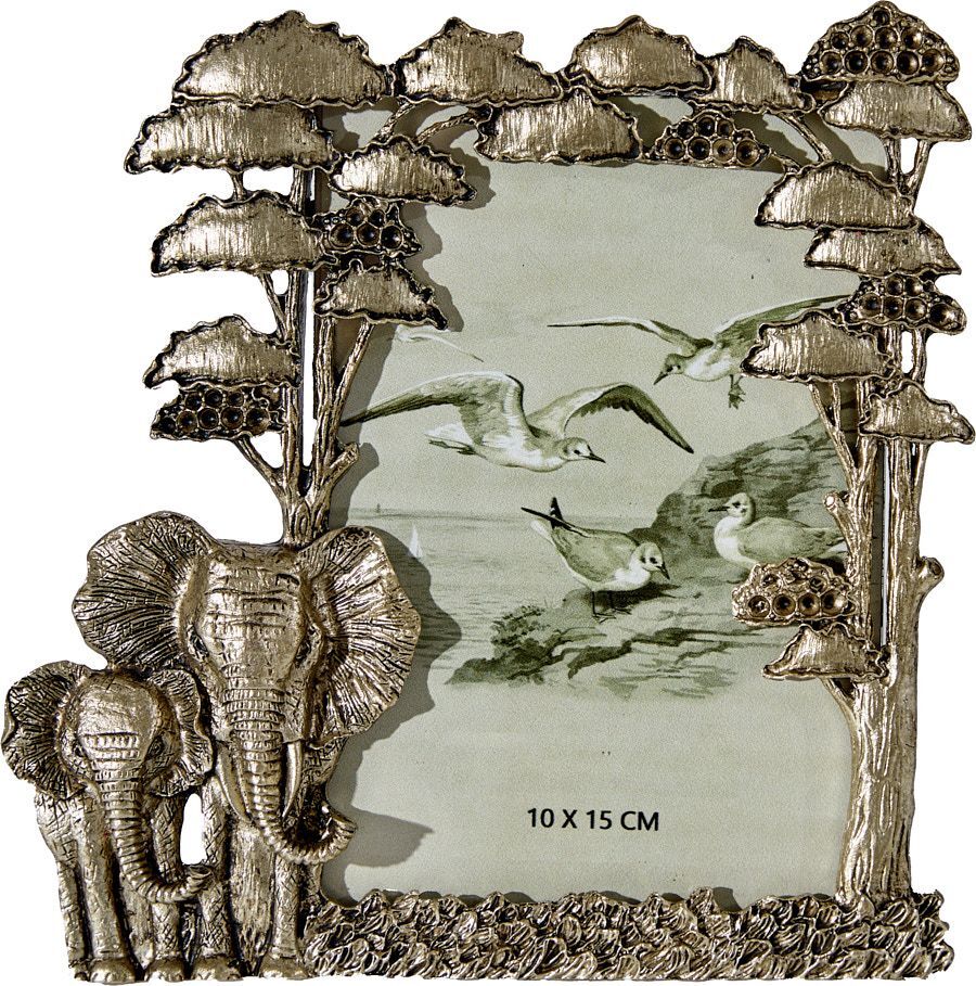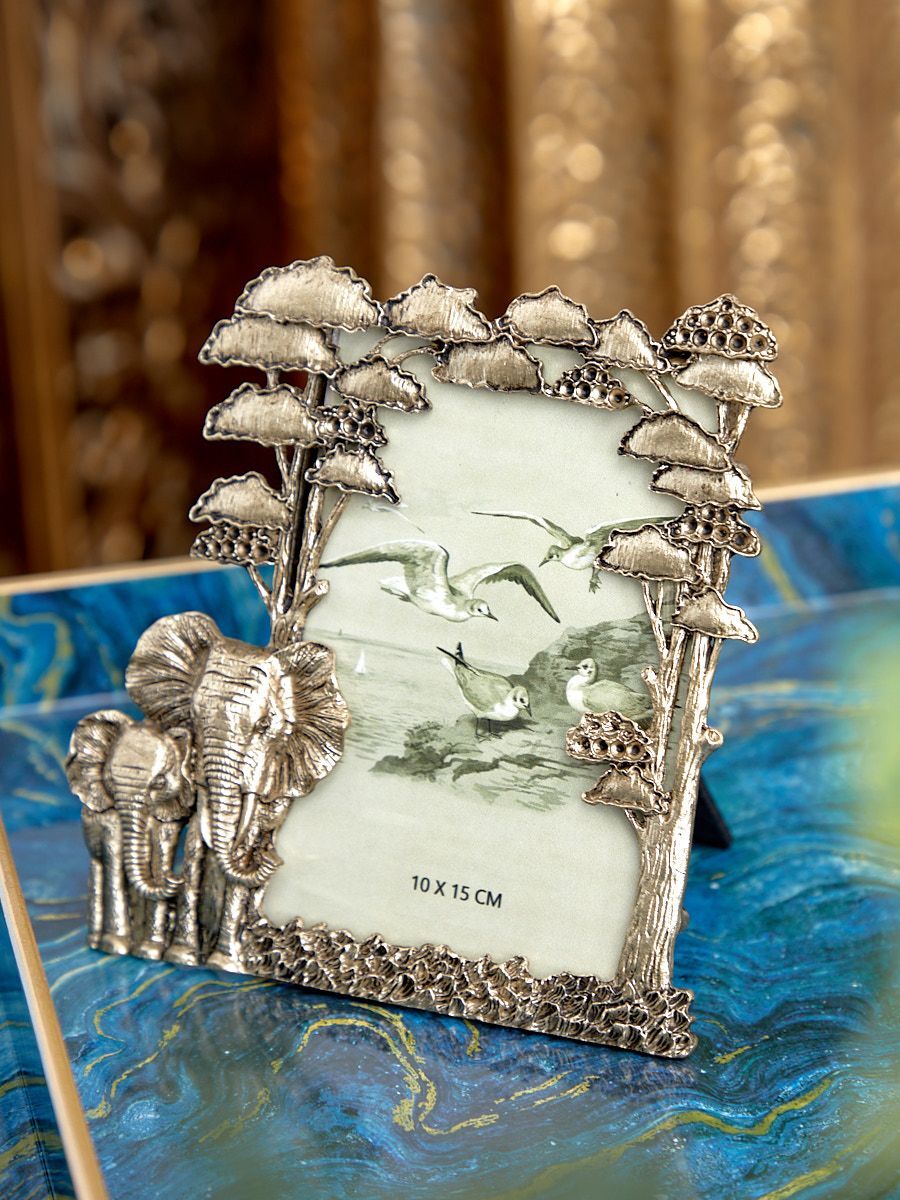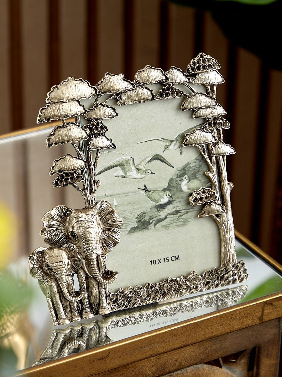 Роскошная настольная фоторамка в стиле сафари, выполненная из металла и украшенная двумя слонами, станет отличным вариантом для оформления ваших фотографий. Изделие сохранит воспоминания о самых ярких моментах вашей жизни, а изящная форма и резные элементы сделают ее прекрасным декором.