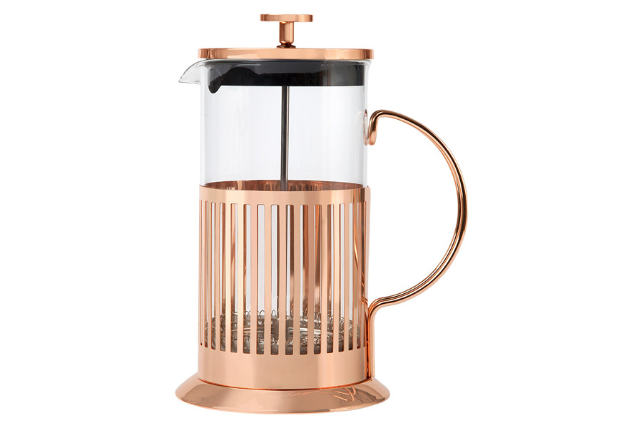 Колба (боросиликатное стекло) - 1,0 л, держатель колбы (нержавеющая сталь 201, покрыта гальваническим розовым золотом), крышка с поршнем-фильтром (нержавеющая сталь 304, пластик), мерная ложка (пластик)