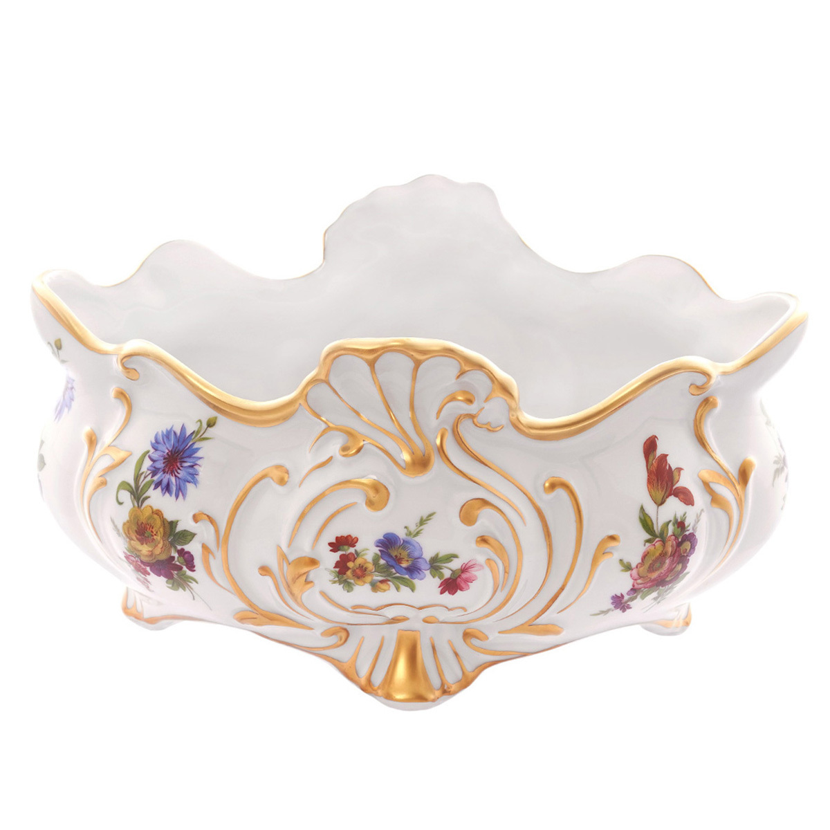 Удивляйте гостей красивой и необычной сервировкой с предметами посуды легендарной серии «Мейсенский букет». Обилия ярких соцветий в сочетании с кружевом позолоты создают торжество вкуса и превращают каждый день в праздник. Фруктовница ладья украсит десертный стол, обеденную сервировку и просто станет прекрасным украшением интерьера даже без содержимого. Такая она — самобытная и самодостаточная, посуда из чешского фарфора торговой марки Queen's Crown!