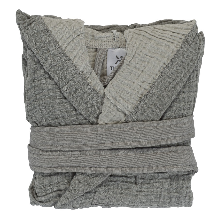 "Халат из жатого хлопка серого цвета из коллекции Essential лаконичного дизайна и нейтральной расцветки подойдет и мальчику, и девочке. Изделие с капюшоном и с удобным запахом фиксируется на талии широким поясом. , ,