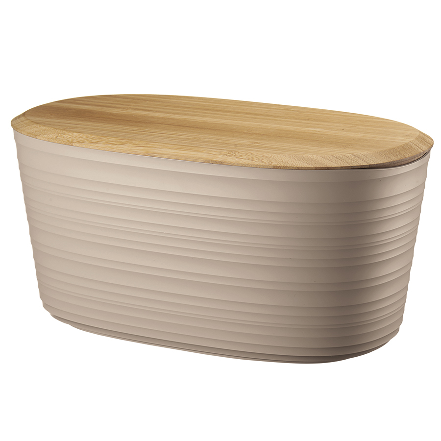 "Хлебница из переработанного пластика с бамбуковой крышкой Tierra спасет выпечку от высыхания и украсит пространство кухни. Ее также можно использовать в качестве оригинального органайзера. Изделие выполнено из переработанных пластиковых бутылок из-под воды.