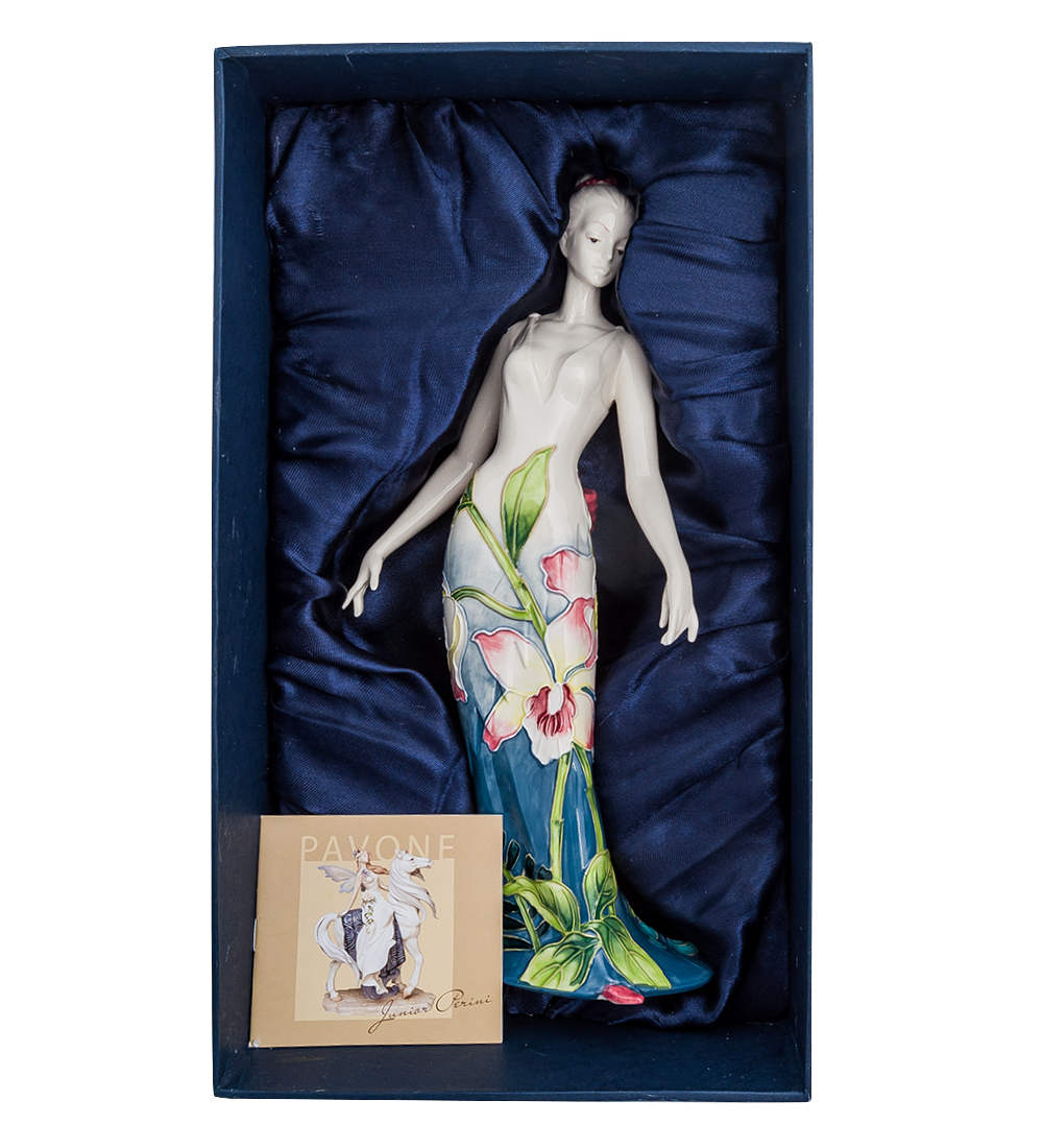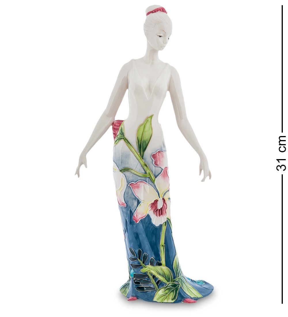 Молодая красивая женщина одета в необычное по расцветке платье. Оно спускается до земли и в нижней части принимает темный цвет глубокой синей тени, из которой тянутся вверх, к дневному свету, зеленые стебли с яркими листьями и крупными прекрасными цветами. Огромный бант на поясе тоже кажется одним из таких цветов. Чем выше, тем больше платье теряется на фоне тела и его сменяет естественная красота женской фигуры, плавные движения рук, горделивая осанка. Прическа перехвачена красным обручем, гармонирующим с бантом на платье. Такая фигурка станет настоящим украшением любой комнаты, символом единства красоты тела и красоты природы.